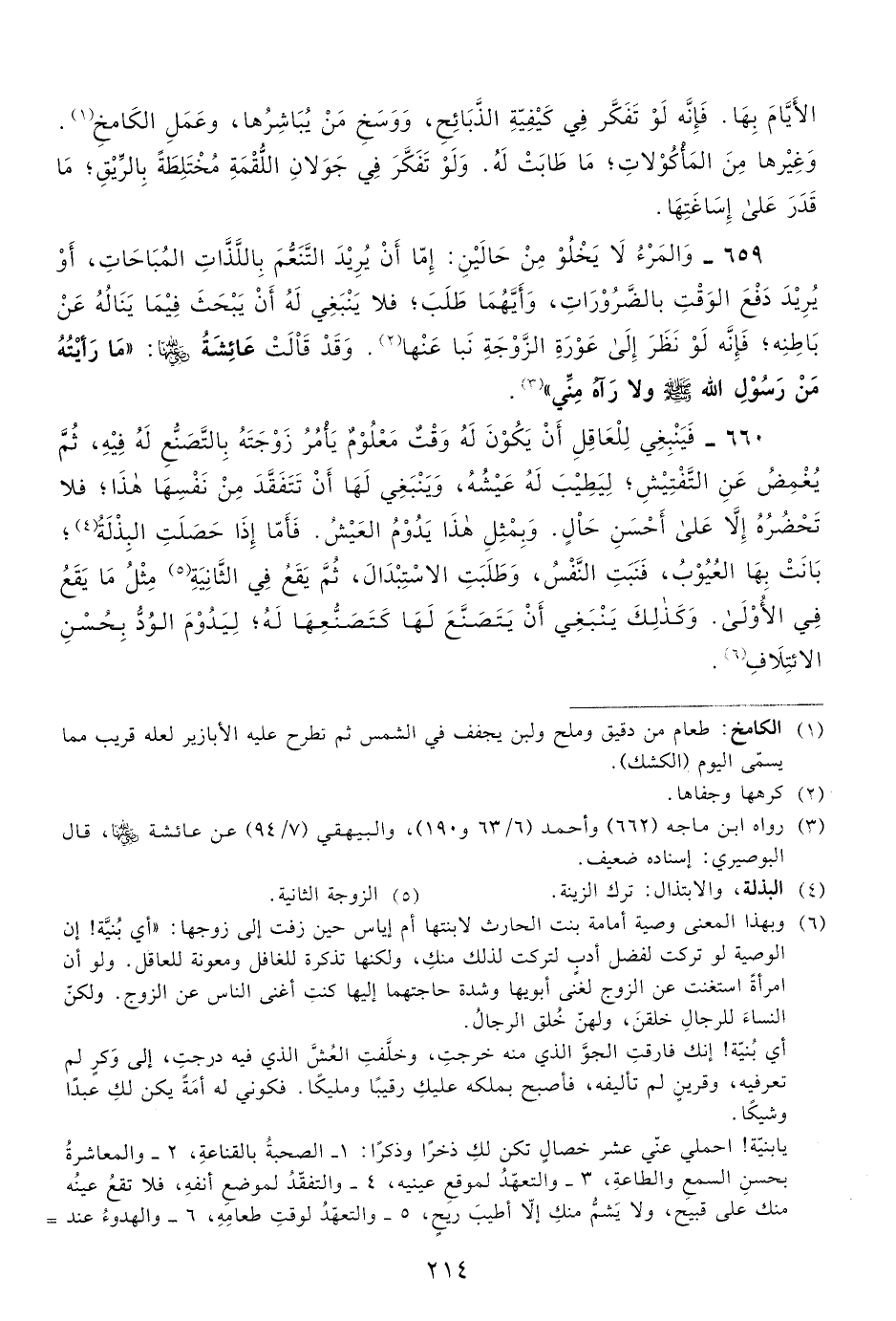 660- فينبغي للعاقل أن يكون له وقت معلوم يأمر زوجته بالتصنع له فيه، ثم يغمض عن التفتيش، ليطيب له عيشه، وينبغي لها أن تتفقد من نفسها هذا، فلا تحضره إلا على أحسن حال. وبمثل هذا يدوم العيش. فأما إذا حصلت البذلة4، بانت بها العيوب، فنبت النفس، وطلبت الاستبدال، ثم يقع في الثانية5 مثل ما يقع في الأولى، وكذلك ينبغي أن يتصنع لها كتصنعها له، ليدوم الود بحسن الائتلاف6.