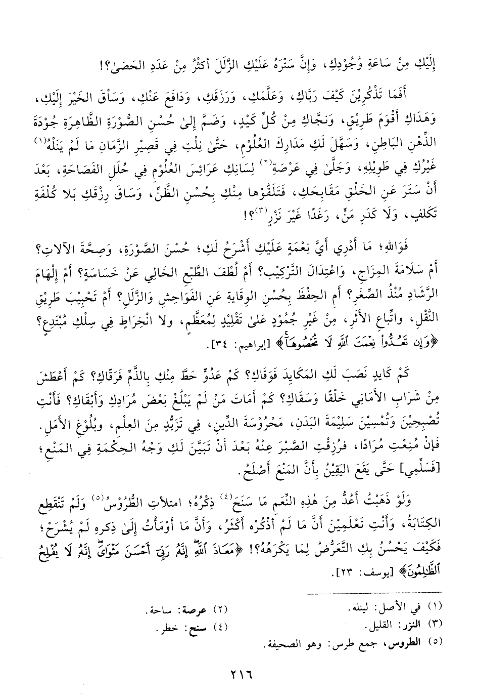 أفما تذكرين كيف رباك، وعلمك، ورزقك، ودافع عنك، وساق الخير إليك، وهداك أقوم طريق، ونجاك من كل كيد، وضم إلى حسن الصورة الظاهرة جودة الذهن الباطن، وسهل لك مدارك العلوم، حتى نلت في قصير الزمان رزقك بلا كلفة تكلف، ولا كدر من، رغدًا غير نزرٍ3؟!