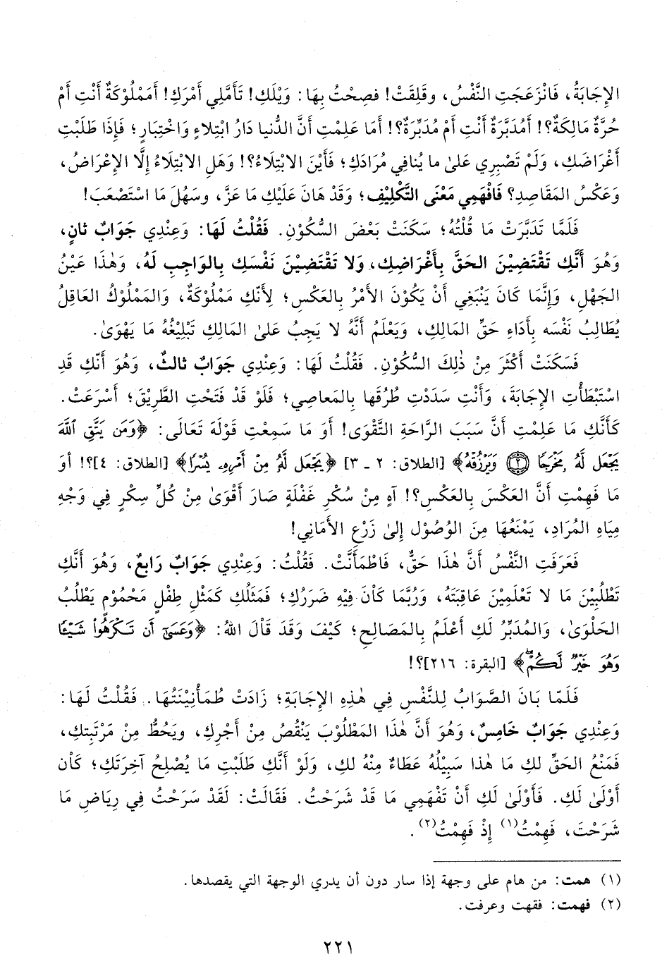 الإجابة، فانزعجت النفس، وقلقت! فصحت بها: ويلك! تأملي أمرك! أمملوكة أنت أم حرة مالكة؟! أمدبرة أنت أم مدبرة؟! أما علمت أن الدنيا دار ابتلاء واختبار؛ فإذا طلبت أغراضك، ولم تصبري على ما ينافي مرادك، فأين الابتلاء؟! وهل الابتلاء إلا الإعراض، وعكس المقاصد؟ فافهمي معنى التكليف، وقد هان عليك ما عز، وسهل ما استصعب!