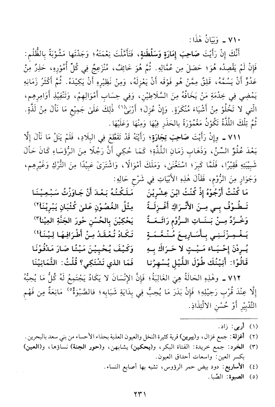 711- وإن رأيت صاحب تجارة، رأيته قد تقطع في البلاد، فلم ينل ما نال إلا بعد علو السن، وذهاب زمان اللذة، كما حكي أن رجلًا من الرؤساء كان حال شبيبته فقيرًا؛ فلما كبر، استغنى، وملك أموال، واشترى عبيدًا من الترك وغيرهم، وجوار من الروم، فقال هذه الأبيات في شرح حاله:
