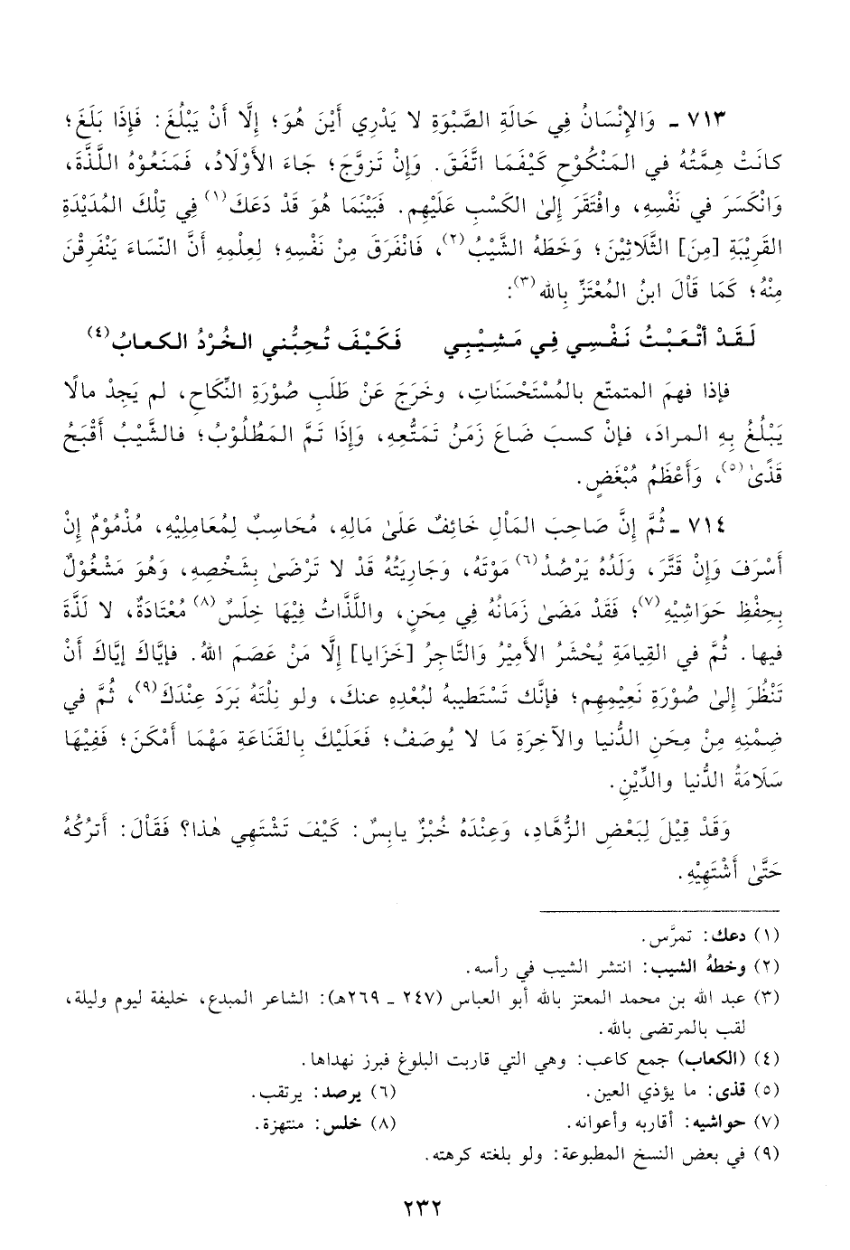 713- والإنسان في حالة الصبوة لا يدري أين هو؛ إلا أن يبلغ: فإذا بلغ، كانت همته في المنكوح كيفما اتفق. وإن تزوج، جاء الأولاد، فمنعوه اللذة، وانكسر في نفسه، وافتقر إلى الكسب عليهم. فبينما هو قد دعك1 في تلك المديدة القريبة "من" الثلاثين وخطة الشيب2، فانفرق من نفسه، لعلمه أن النساء يتفرقن منه، كما قال ابن المعتز بالله3: