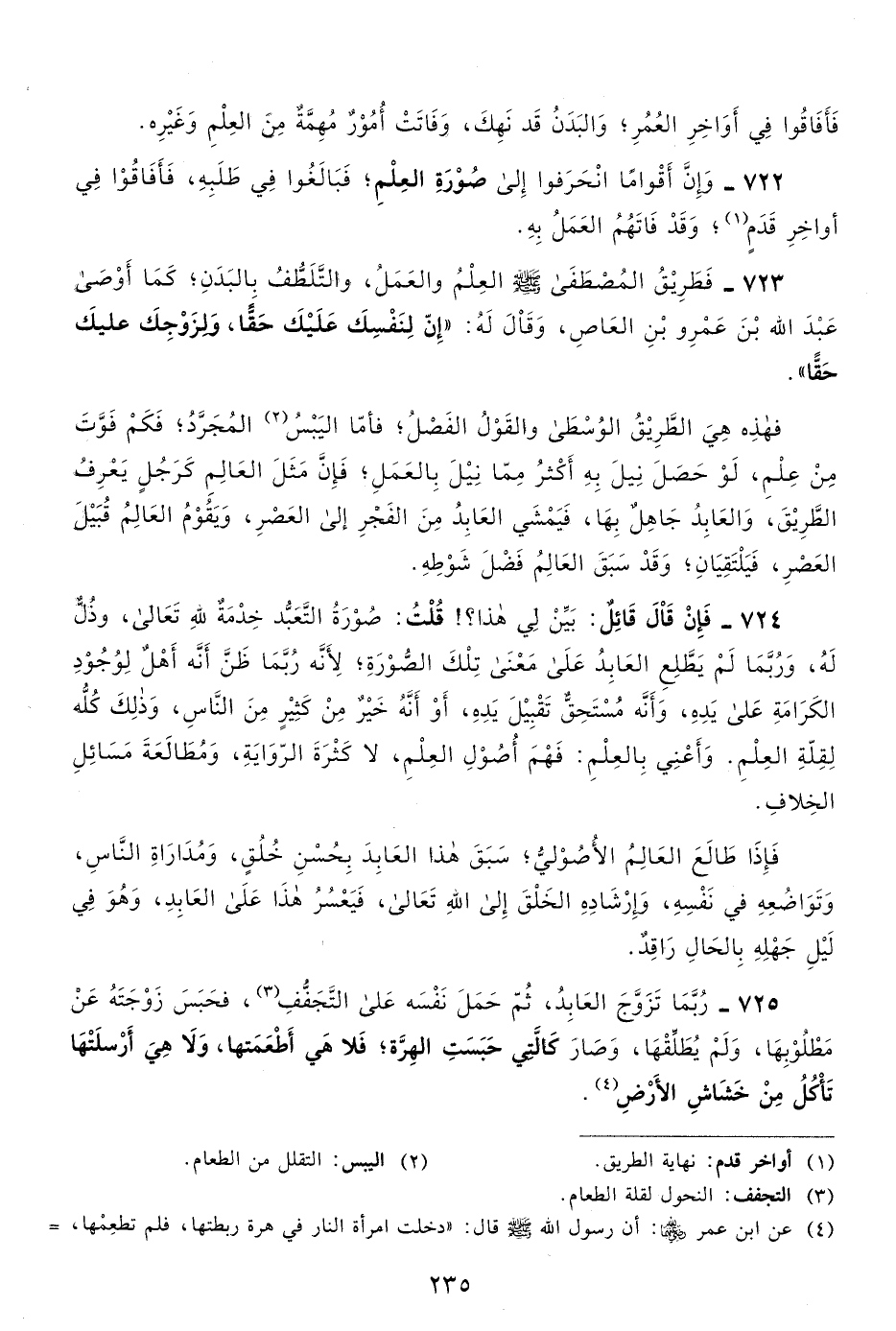 723- فطريق المصطفى صلى الله عليه وسلم العلم والعمل، والتلطف بالبدن، كما أوصى عبد الله بن عمرو بن العاص، وقال له: "إن لنسك عليك حقًّا، ولزوجك عليك حقًّا".