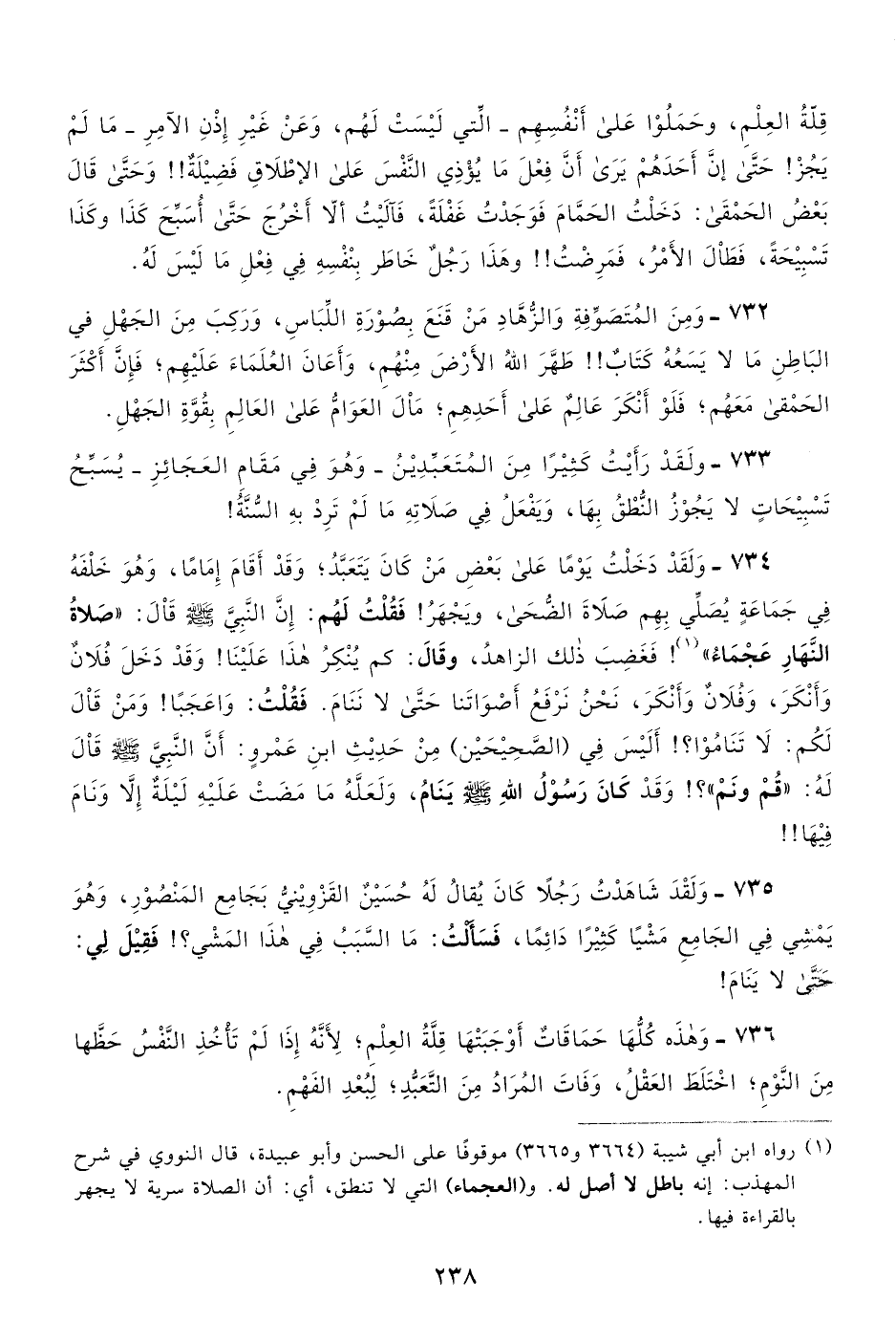 736- وهذه كلها حماقات أوجبتها قلة العلم؛ لأنه إذا لم تأخذ النفس حظها من النوم، اختلط العقل، وفات المراد من التعبد، لبعد الفهم.