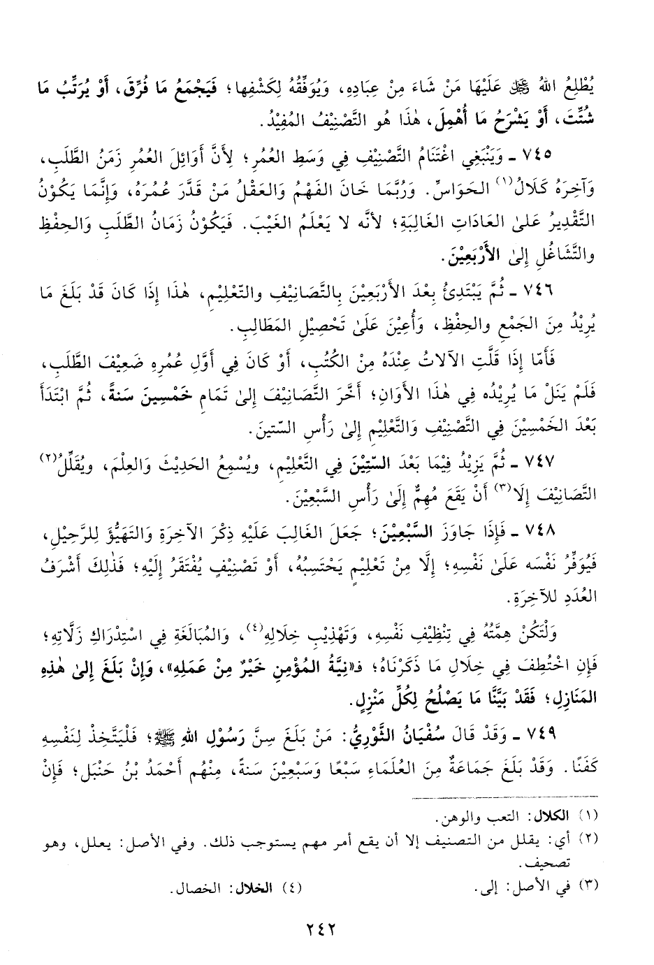 746- ثم يبتدئ بعد الأربعين بالتصانيف والتعليم، هذا إذا كان قد بلغ مع ما يريد من الجمع والحفظ، وأعين على تحصيل المطالب.