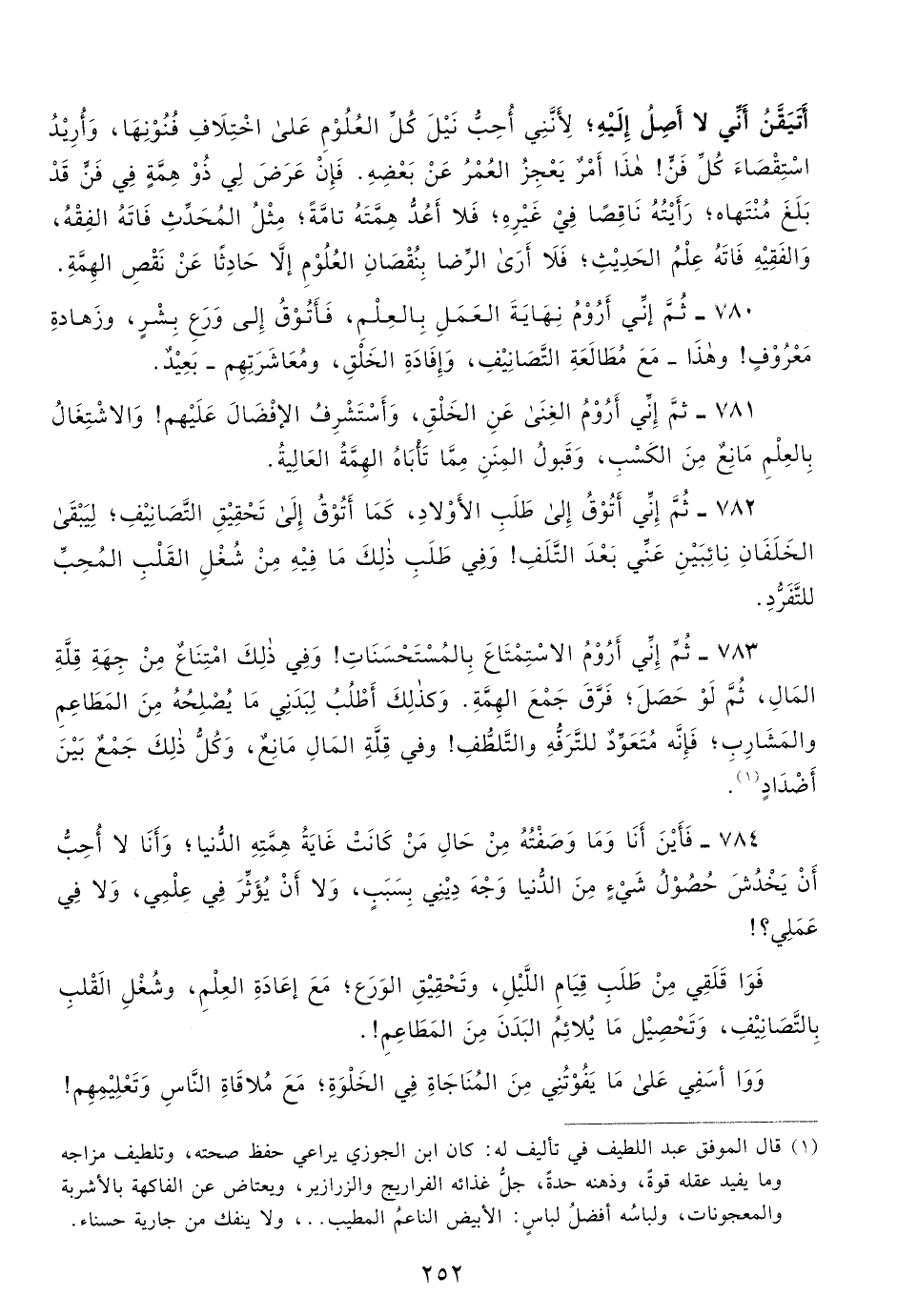781- ثم إني أروم الغنى عن الخلق، وأستشرف الإفضال عليهم! والاشتغال بالعلم مانع من الكسب، وقبول المنن مما تأباه الهمة العالية.