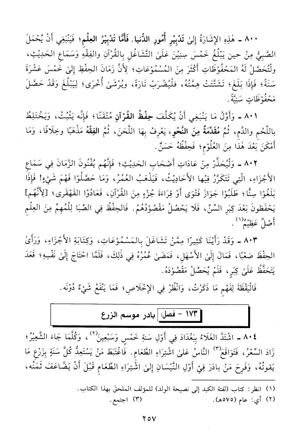 800- هذه الإشارة إلى تدبير أمور الدنيا. فأما تدبير العلم، فينبغي أن يحمل الصبي من حين يبلغ خمس سنين على التشاغل بالقرآن والفقه وسماع الحديث، ولتحصل له المحفوظات أكثر من المسموعات؛ لأن زمان الحفظ إلى خمس عشرة سنة، فإذا بلغ، تشتت همته، فليضرب تارة، ويرشى أخرى، ليبلغ وقد حصل محفوظات سنيَّةً.