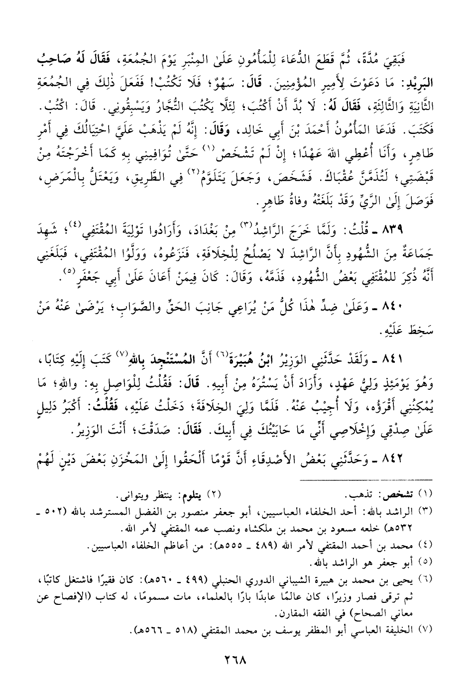 6 يحيى بن محمد بن هبيرة الشيباني الدوري الحنبلي "499-560هـ": كان فقيرًا فاشتغل كاتبًا، ثم ترقى فصار وزيرًا، كان عالمًا عابدًا بارًّا بالعلماء، مات مسمومًا، له كتاب "الإفصاح عن معاني الصحاح" في الفقه المقارن.