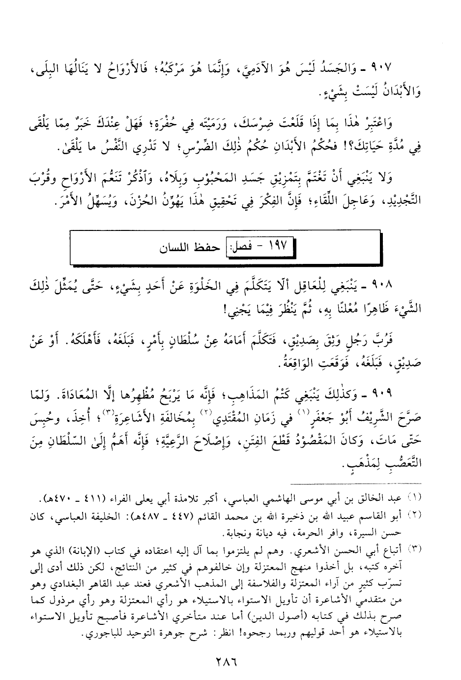909- وكذلك ينبغي كتم المذاهب، فإنه ما يربح مظهرها إلا المعاداة. ولما صرح الشريف أبو جعفر1 في زمان المقتدي2 بمخالفة الأشاعرة3، أخذ، وحبس حتى مات، وكان المقصود قطع الفتن، وإصلاح الرعية، فإنه أهم إلى السلطان من التعصب لمذهب.