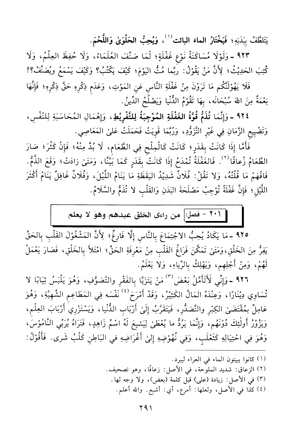 923- ولولا مساكنة نوع غفلة، لما صنف العلماء، ولا حفظ العلم، ولا كتب الحديث؛ لأن من يقول: ربما مت اليوم، كيف يكتب؟ وكيف يسمع ويصنف؟! فلا يهولنكم ما ترون من غفلة الناس عن الموت، وعدم ذكره حق ذكره؛ فإنها نعمة من الله سبحانه، بها تقوم الدنيا ويصلح الدين.