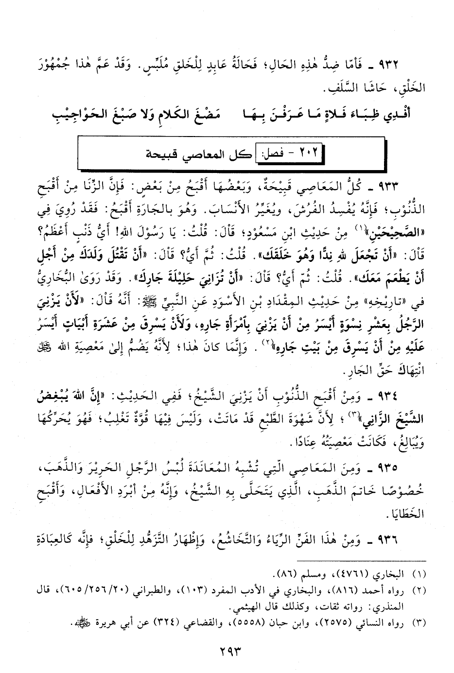 934- ومن أقبح الذنوب أن يزني الشيخ، ففي الحديث: "إن الله يبغض الشيخ الزاني" 3؛ لأن شهوة الطبع قد ماتت، وليس فيها قوة تغلب، فهو يحركها ويبالغ، فكانت معصيته عنادًا.