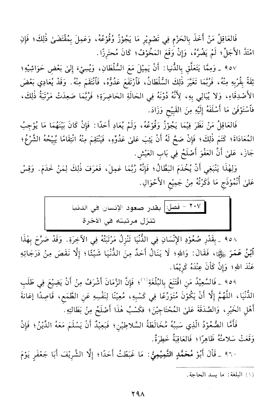959- فالسعيد من اقتنع بالبلغة1، فإن الزمان أشرف من أن يضيع في طلب الدنيا، اللهم إلا أن يكون متورعًا في كسبه، معينًا لنفسه عن الطمع، قاصدًا إعانة أهل الخير، والصدقة على المحتاجين، فكسب هذا أصلح من بطالته.