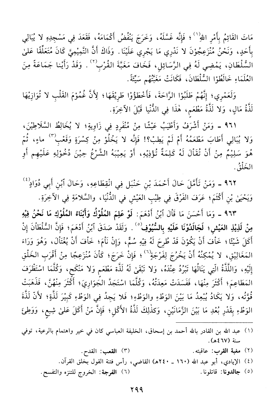 962- ومن تأمل حال أحمد بن حنبل في انقطاعه، وحال ابن أبي داود4 ويحيى بن أكثم، عرف الفرق في طيب العيش في الدنيا، والسلامة في الآخرة.