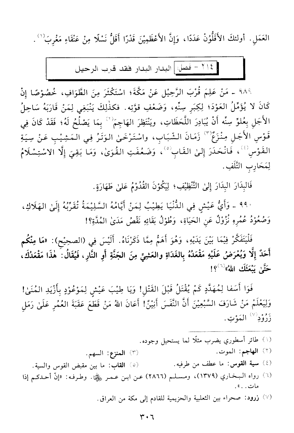 989- من علم قرب الرحيل عن مكة، استكثر من الطواف خصوصًا إن كان لا يؤمل العود، ليكبر سنه، وضعف قوته. فكذلك ينبغي لمن قاربه ساحل الأجل بعلو سنه أن يبادر اللحظات، وينتظر الهاجم1 بما يصلح له، فقد كان في قوس الأجل منزع2 زمان الشباب، واسترخى الوتر في المشيب عن سية القوس3، فانحدر إلى القاب4، وضعفت القوى، وما بقي إلا الاستسلام لمحارب التلف.