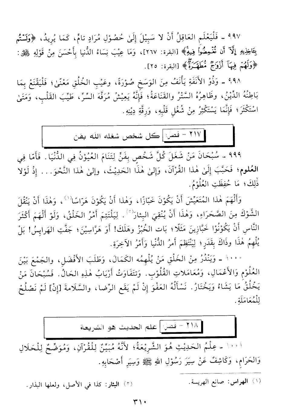 999- سبحان من شغل كل شخص بفن لتنام العيون في الدنيا. فأما في العلوم، فحبب إلى هذا القرآن، وإلى هذا الحديث، وإلى هذا النحو ... إذ لولا ذلك، ما حفظت العلوم.