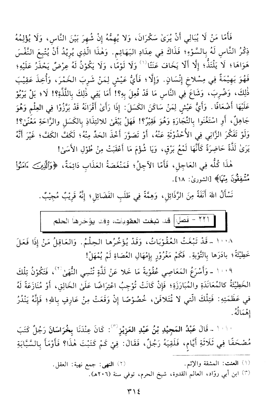 فأما من لا يبالي أن يرى سكران، ولا يهمه إن شهر بين الناس، ولا يؤلمه ذكر الناس له بالسوء، فذاك في عداد البهائم، وهذا الذي يريد أن يتبع النفس هواها، لا يلتذ، إلا ألا يخاف عنتًا1ولا لومًا، ولا يكون له عرض يحذر عليه، فهو بهيمة في مسلاخ إنسان؛ وإلا فأي عيش لمن شرب الخمر، وأخذ عقيب ذلك، وضرب، وشاع في الناس ما قد فعل به؟! أما يفي ذلك باللذة؟! لا، بل يربو ذلك، وضرب، وشاع في الناس ما قد فعل به؟! أما يفي ذلك باللذة؟! لا، بل يربو عليها أضعافًا. وأي عيش لمن ساكن الكسل: إذا رأى أقرانه قد برزوا في العلم وهو جاهل، أو استغنوا بالتجارة وهو فقير؟! فهل يبقى للالتذاذ بالكسل والراحة معنى؟! ولو تفكر الزاني في الأحدوثة عنه، أو تصور أخذ الحد منه، لكف الكف، غير أنه يرى لذة حاضرة كأنها لمع برق، ويا شؤم ما أعقبت من طول الأسى!