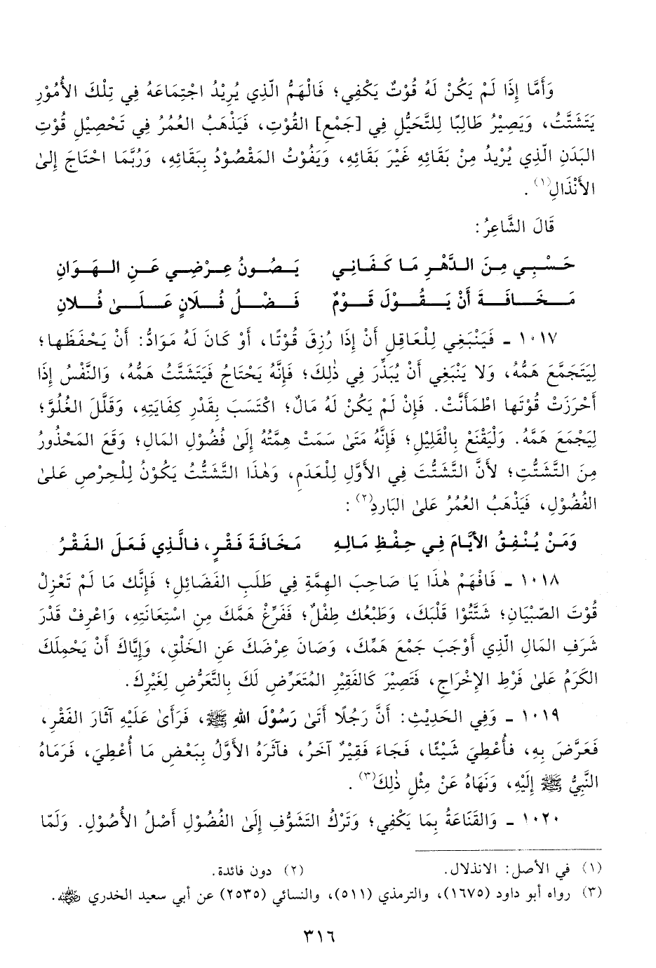 1020- والقناعة بما يكفي، وترك التشوف إلى الفضول أصل الأصول. ولما