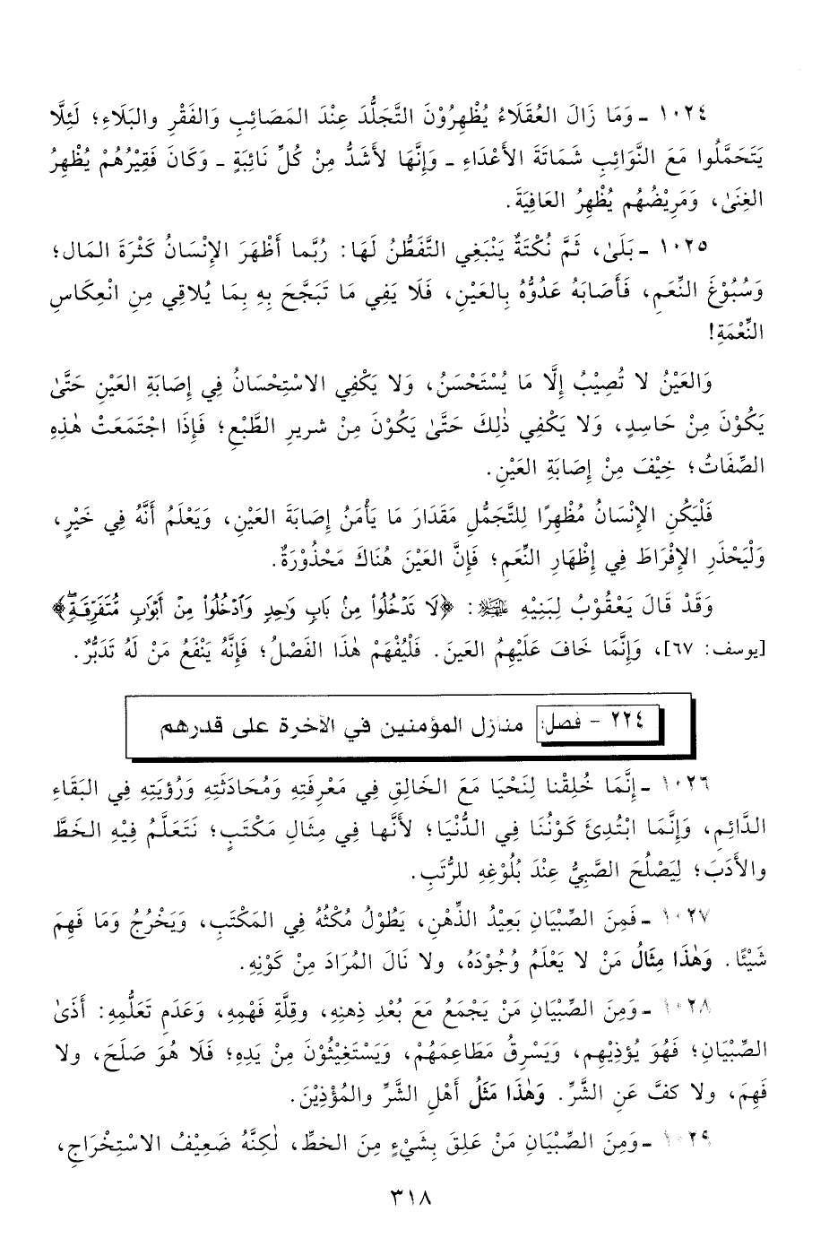 1025- بلى، ثم نكتة ينبغي التفطن لها: ربما أظهر الإنسان كثرة المال، وسبوغ النعم، فأصابه عدوه بالعين، فلا يفي ما تبجح به بما يلاقي من انعكاس النعمة!