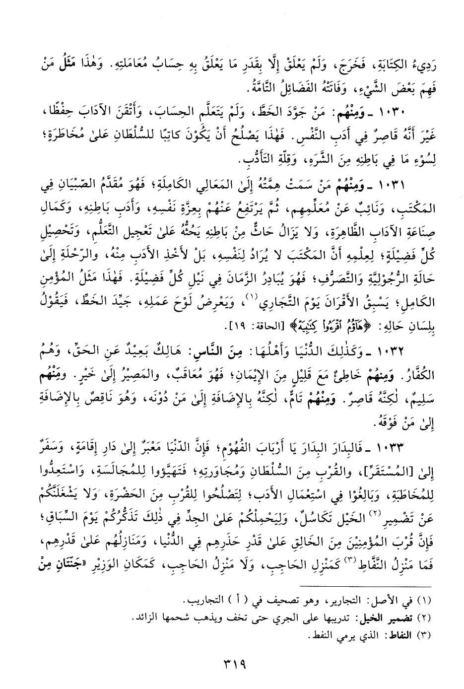 1030- ومنهم: من جود الخط، ولم يتعلم الحساب، وأتقن الآداب حفظًا، غير أنه قاصر في أدب النفس. فهذا يصلح أن يكون كاتبًا للسلطان على مخاطرة، لسوء ما في باطنه من الشره، وقلة التأدب.