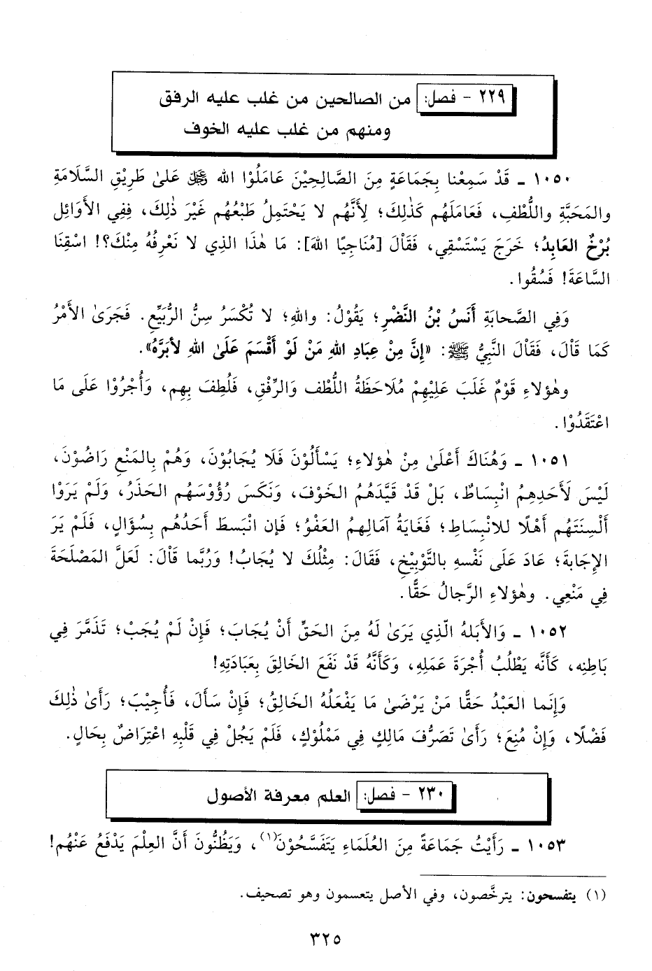 1050- قد سمعنا بجماعة من الصالحين عاملوا الله عز وجل على طريق السلامة والمحبة واللطف، فعاملهم كذلك؛ لأنهم لا يحتمل طبعهم غير ذلك، ففي الأوائل برخ العابد، خرج يستسقي، فقال [مناجيًا الله] : ما هذا الذي لا نعرفه منك؟! اسقنا الساعة فسقوا.