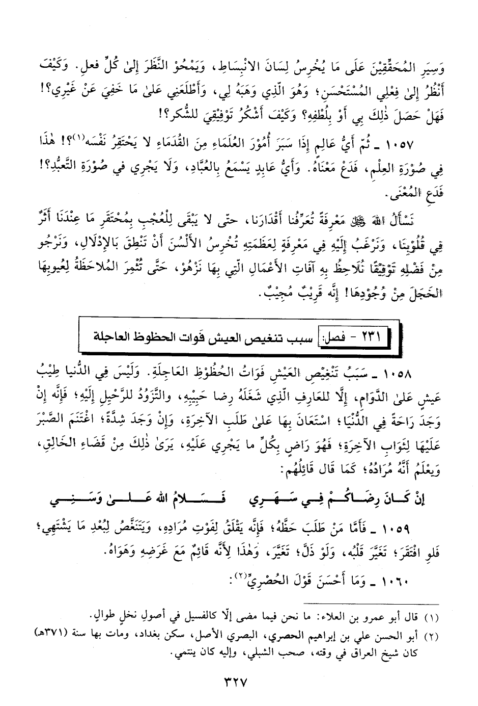 1058- سبب تنغيص العيش فوات الحظوظ العاجلة. وليس في الدنيا طيب عيش على الدوام؛ إلا للعارف الذي شغله رضا حبيبه، والتزود للرحيل إليه، فإنه إن وجد راحة في الدنيا، استعان بها على طلب الآخرة، وإن وجد شدة، اغتنم الصبر عليها لثواب الآخرة، فهو راضٍ بكل ما يجري عليه، يرى ذلك من قضاء الخالق، ويعلم أنه مراده، كما قال قائلهم: