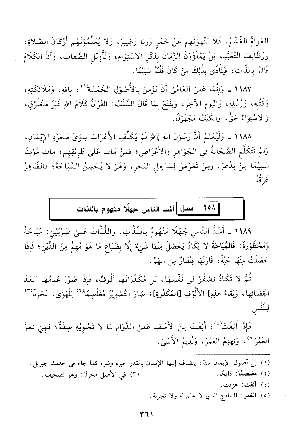 1187- وإنما على العامي أن يؤمن بالأصول الخمسة1، بالله، وملائكته، وكتبه، ورسله، واليوم الآخر، ويقنع بما قال السلف: القرآن كلام الله غير مخلوق، والاستواء حق، والكيف مجهول.