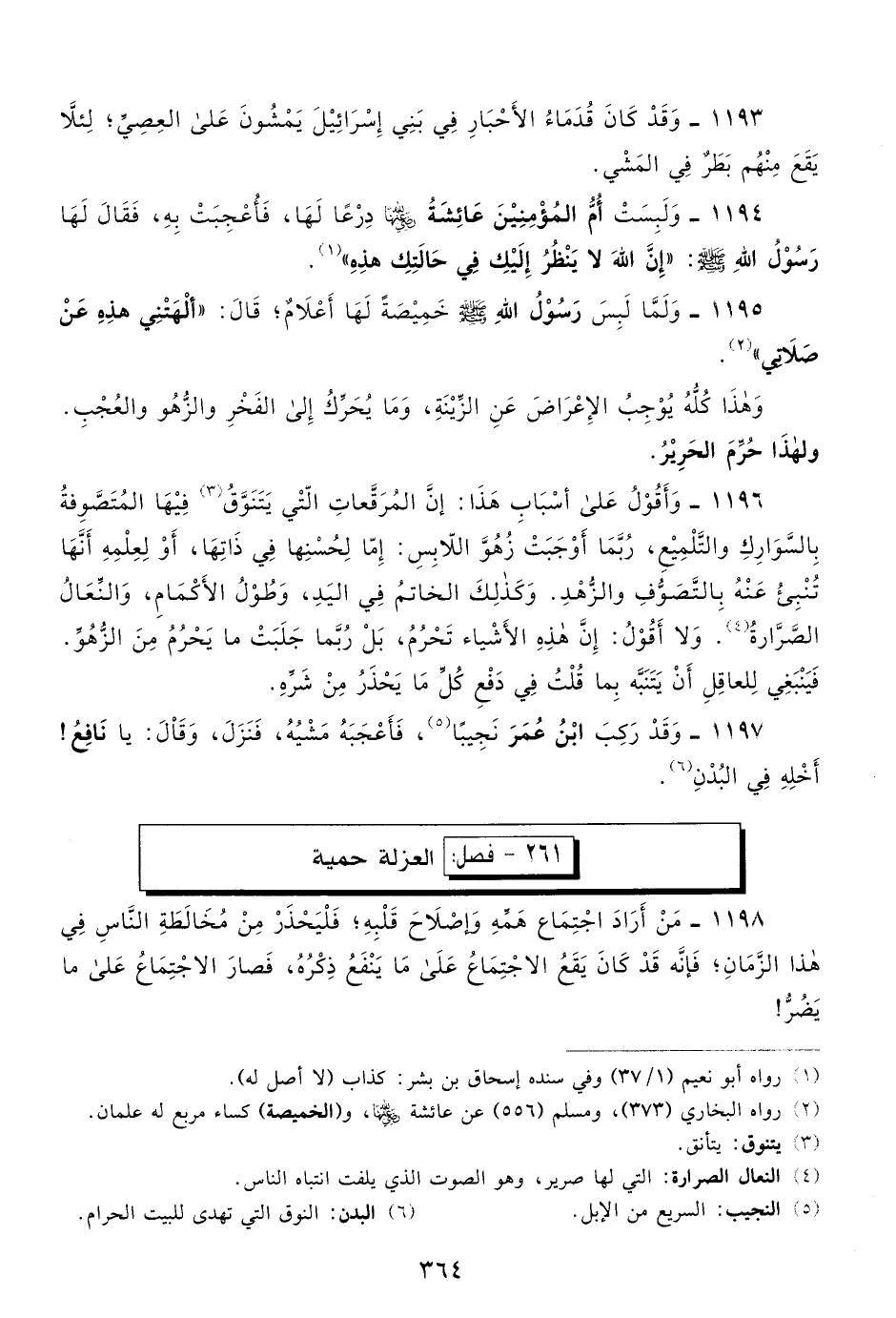 1194- ولبست أم المؤمنين عائشة رضي الله عنها درعًا لها، فأعجبت به، فقال لها رسول الله صلى الله عليه وسلم: "إن الله لا ينظر إليك في حالتك هذه" 1.