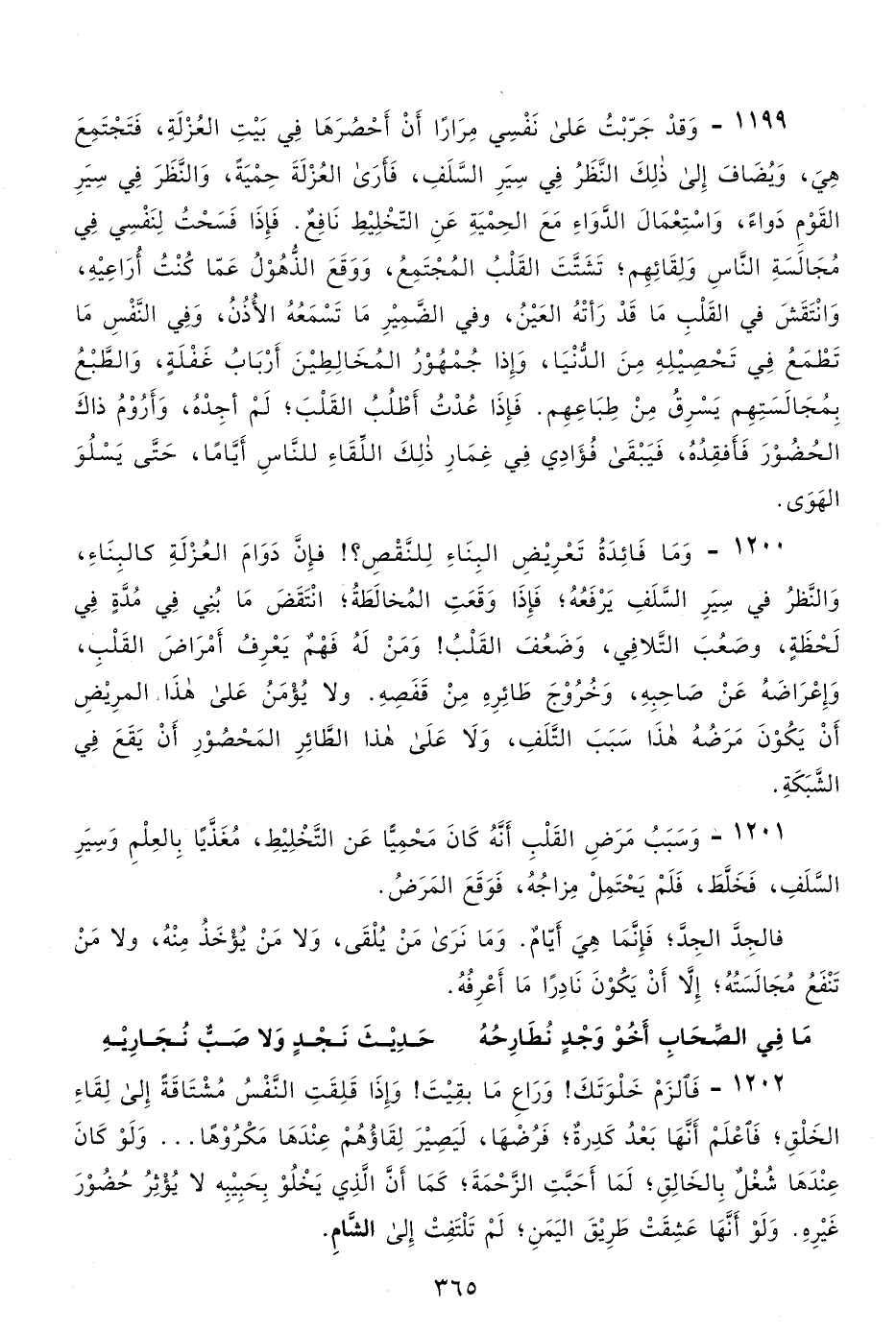 1200- وما فائدة تعريض البناء للنقض؟! فإن دوام العزلة كالبناء، والنظر في سير السلف يرفعه؛ فإذا وقعت المخالطة، انتقض ما بني في مدة في لحظة، وصعب التلافي، وضعف القلب! ومن له فهم يعرف أمراض القلب، وإعراضه عن صاحبه، وخروج طائره من قفصه. ولا يؤمن على هذا المريض أن يكون مرضه هذا سبب التلف، ولا على هذا الطائر المحصور أن يقع في الشبكة.