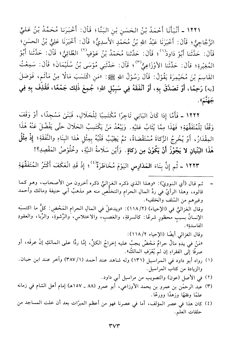 1222- فأما إذا كان الباني تاجرًا مكتسبًا للحلال، فبنى مسجدًا، أو وقف وقفًا للمتفقهة؛ فهذا مما يثاب عليه، ويبعد من يكتسب الحلال حتى يفضل عنه هذا المقدار، أو يخرج الزكاة مستقصاة، ثم يطيب قلبه بمثل هذا البناء والنفقة، إذ مثل هذا البنيان لا يجوز أن يكون من زكاة، وأين سلامة النية، وخلوص المقصد؟!