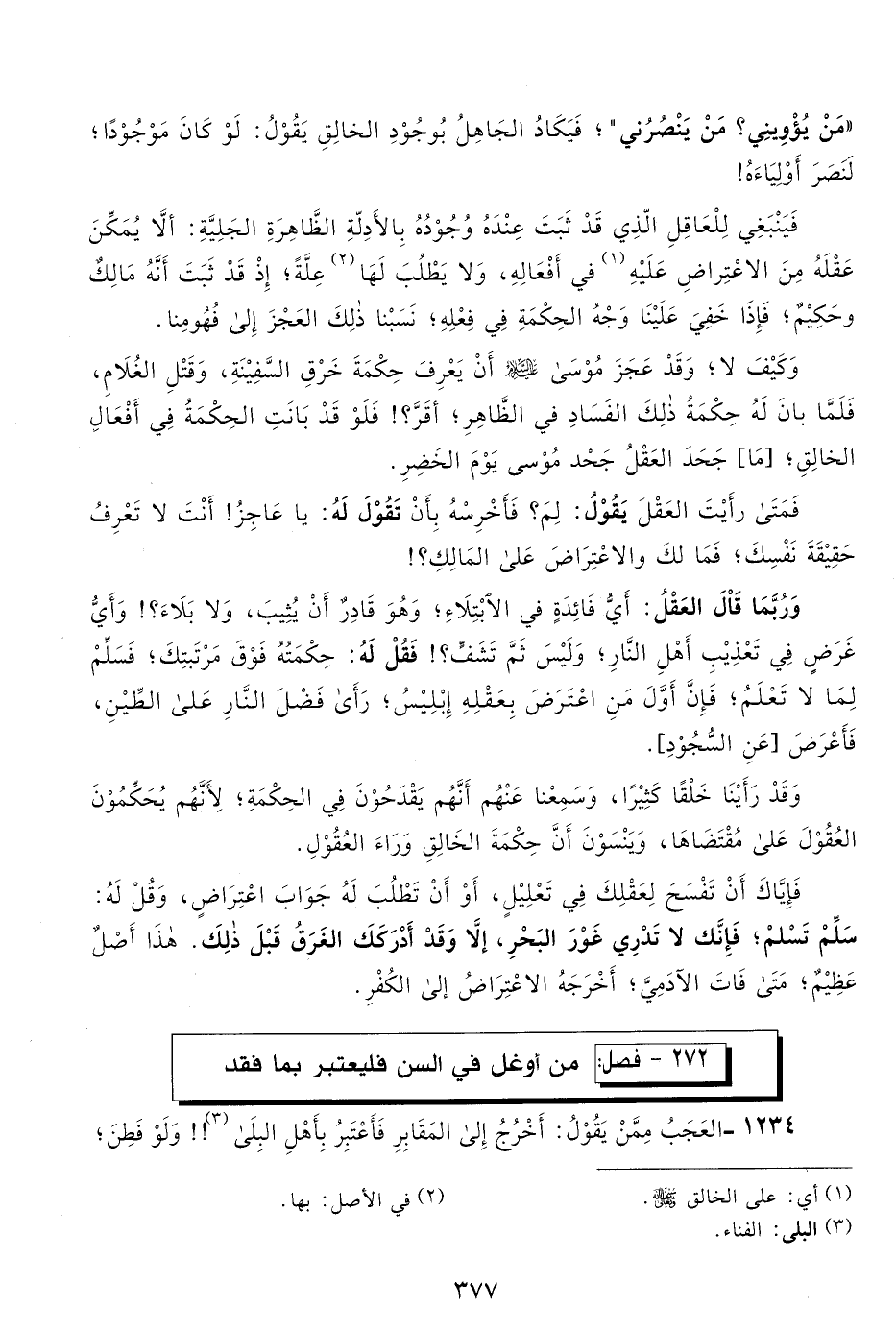 فينبغي للعاقل الذي قد ثبت عنده وجوده بالأدلة الظاهرة الجلية: ألا يمكن عقله من الاعتراض عليه1 في أفعاله، ولا يطلب لها2 علة؛ إذ قد ثبت أنه مالك وحكيم، فإذا خفي علينا وجه الحكمة في فعله، نسبنا ذلك العجز إلى فهومنا.