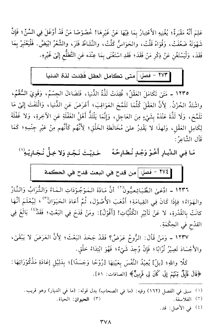 1236- ادعى الطبائعيون1 أن مادة الموجودات الماء والتراب والنار والهواء؛ فإذا كان في القيامة، أذهب الأصول، ثم أعاد الحيوان2، ليعلم أنها كانت بالقدرة، لا عن تأثير الكليات! [أَقُوْلُ] : ومن قدح في البعث؛ فقد3 بالغ في القدح في الحكمة.