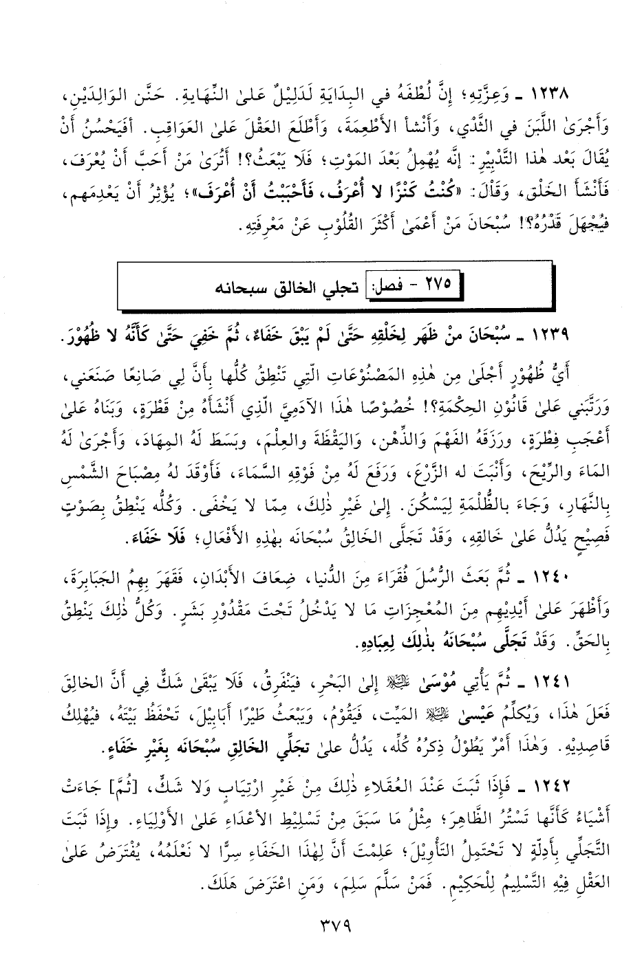 1242- فإذا ثبت عند العقلاء ذلك من غير ارتياب ولا شك، [ثم] جاءت أشياء كأنها تستر الظاهر، مثل ما سبق من تسليط الأعداء على الأولياء، وإذا ثبت التجلي بأدلة لا تحتمل التأويل، علمت أن لهذا الخفاء سرًّا لا نعلمه، يفترض على العقل فيه التسليم للحكيم، فمن سلم سلم، ومن اعترض هلك.