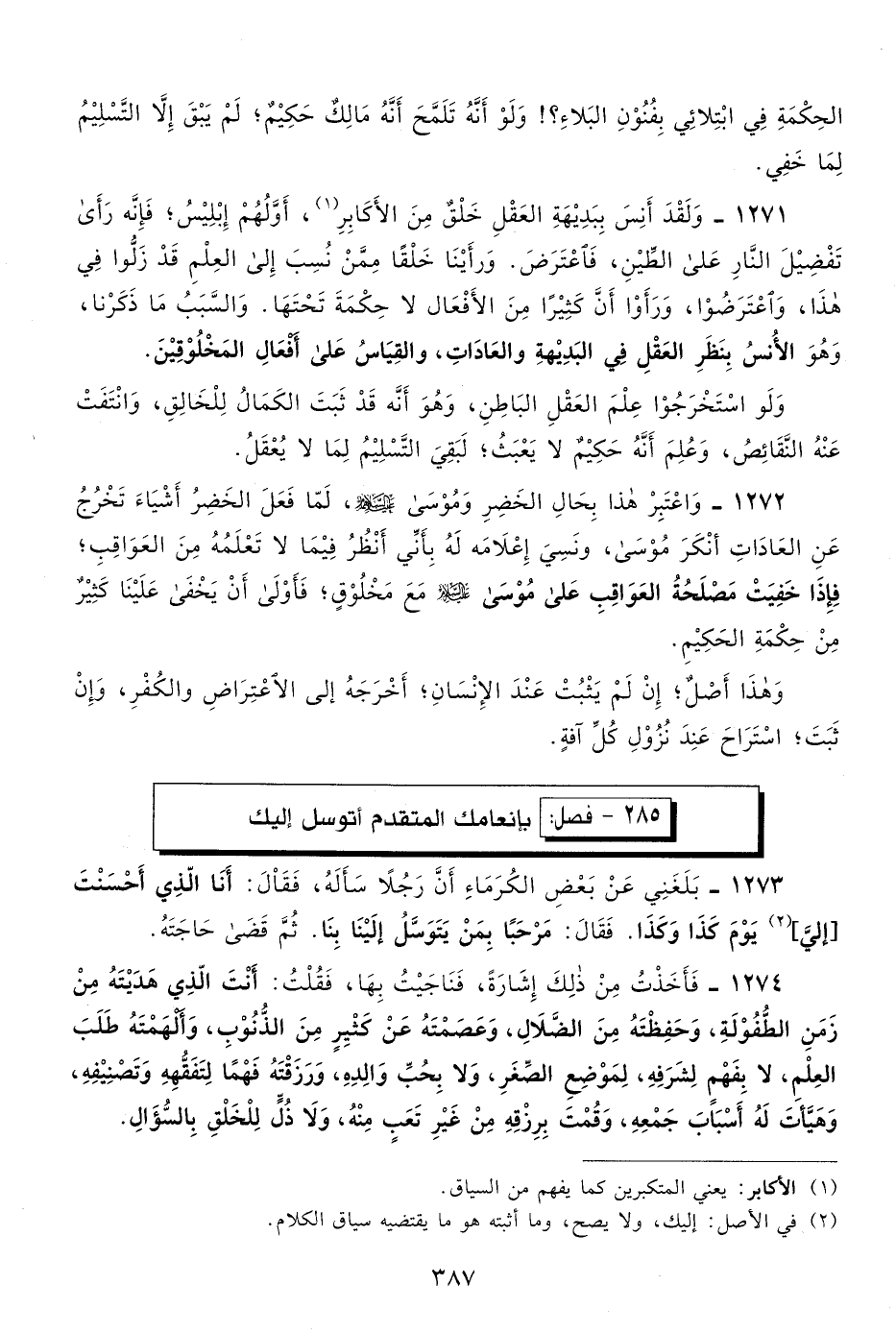 1271- ولقد أنس ببديهة العقل خلق من الأكابر1، أولهم إبليس، فإنه رأى تفضيل النار على الطين، فاعترض. ورأينا خلقًا ممن نسب إلى العلم قد زلوا في هذا، واعترضوا، ورأوا أن كثيرًا من الأفعال لا حكمة تحتها. والسبب ما ذكرنا، وهو الأنس بنظر العقل في البديهة والعادات، والقياس على أفعال المخلوقين.