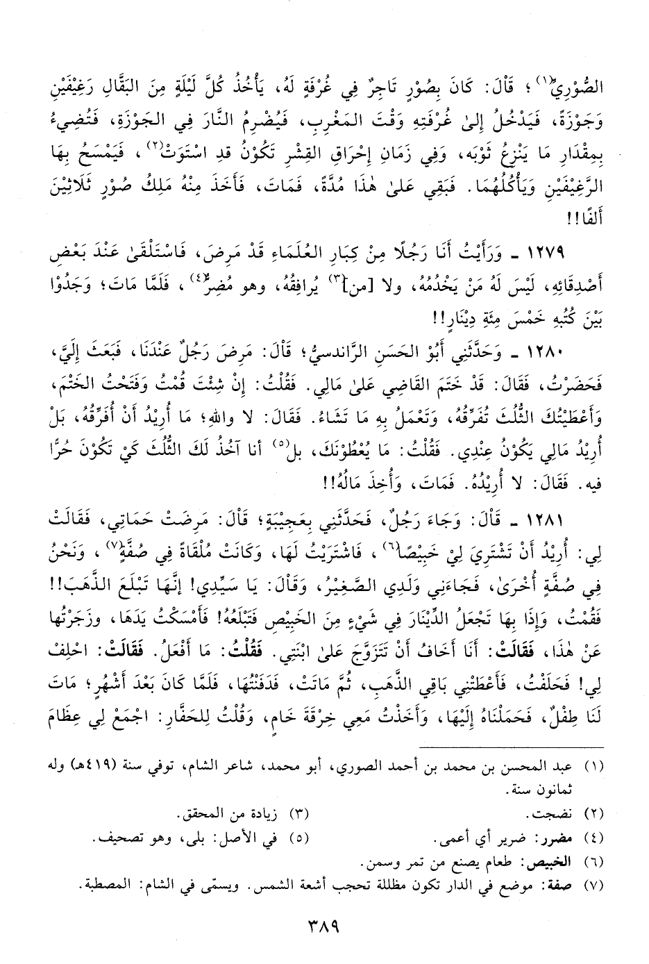 1279- ورأيت أنا رجلًا من كبار العلماء قد مرض، فاستلقى عند بعض أصدقائه، ليس له من يخدمه، ولا "من"3 يرافقه، وهو مضر4، فلما مات، وجدوا بين كتبه خمسمائة دينار!!