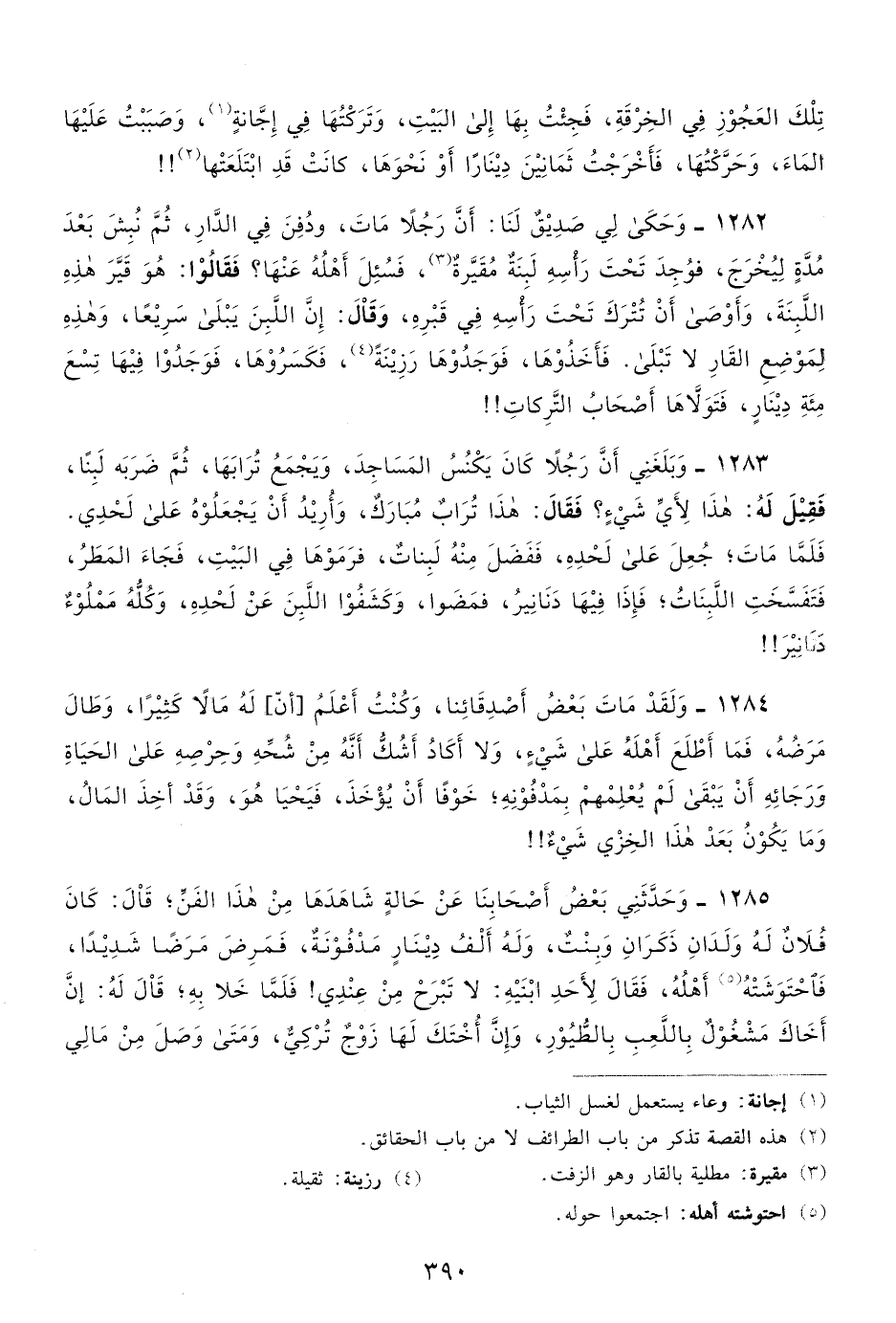 1284- ولقد مات بعض أصدقائنا، وكنت أعلم [أن] له مالًا كثيرًا، وطال مرضه، فما أطلع أهله على شيء، ولا أكاد أشك أنه من شحه وحرصه على الحياة ورجائه أن يبقى لم يعلمهم بمدفونه، خوفًا أن يؤخذ، فيحيا هو، وقد أخذ المال، وما يكون بعد هذا الخزي شيء!!