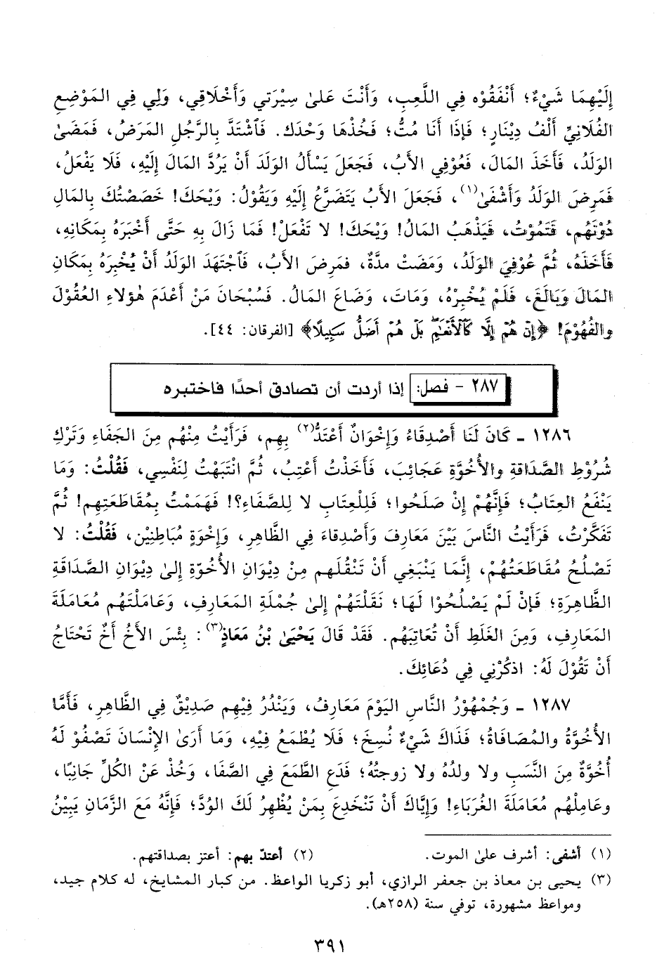1286- كان لنا أصدقاء وإخوان أعتد1 بهم؛ فرأيت منهم من الجفاء وترك شروط الصداقة والأخوة عجائب، فأخذت أعتب، ثم انتبهت لنفسي، فقلت: وما ينفع العتاب؛ فإنهم إن صلحوا، فللعتاب لا للصفاء؟! فهممت بمقاطعتهم! ثم تفكرت، فرأيت الناس بين معارف وأصدقاء في الظاهر، وإخوة مباطنين، فقلت: لا تصلح مقاطعتهم؛ إنما ينبغي أن تنقلهم من ديوان الأخوة إلى ديوان الصداقة الظاهرة، فإن لم يصلحوا لها، نقلتهم إلى جملة المعارف، وعاملتهم معاملة المعارف، ومن الغلط أن تعاتبهم، فقد قال يحيى بن معاذ2: بئس الأخ أخ تحتاج أن تقول له: اذكرني في دعائك.