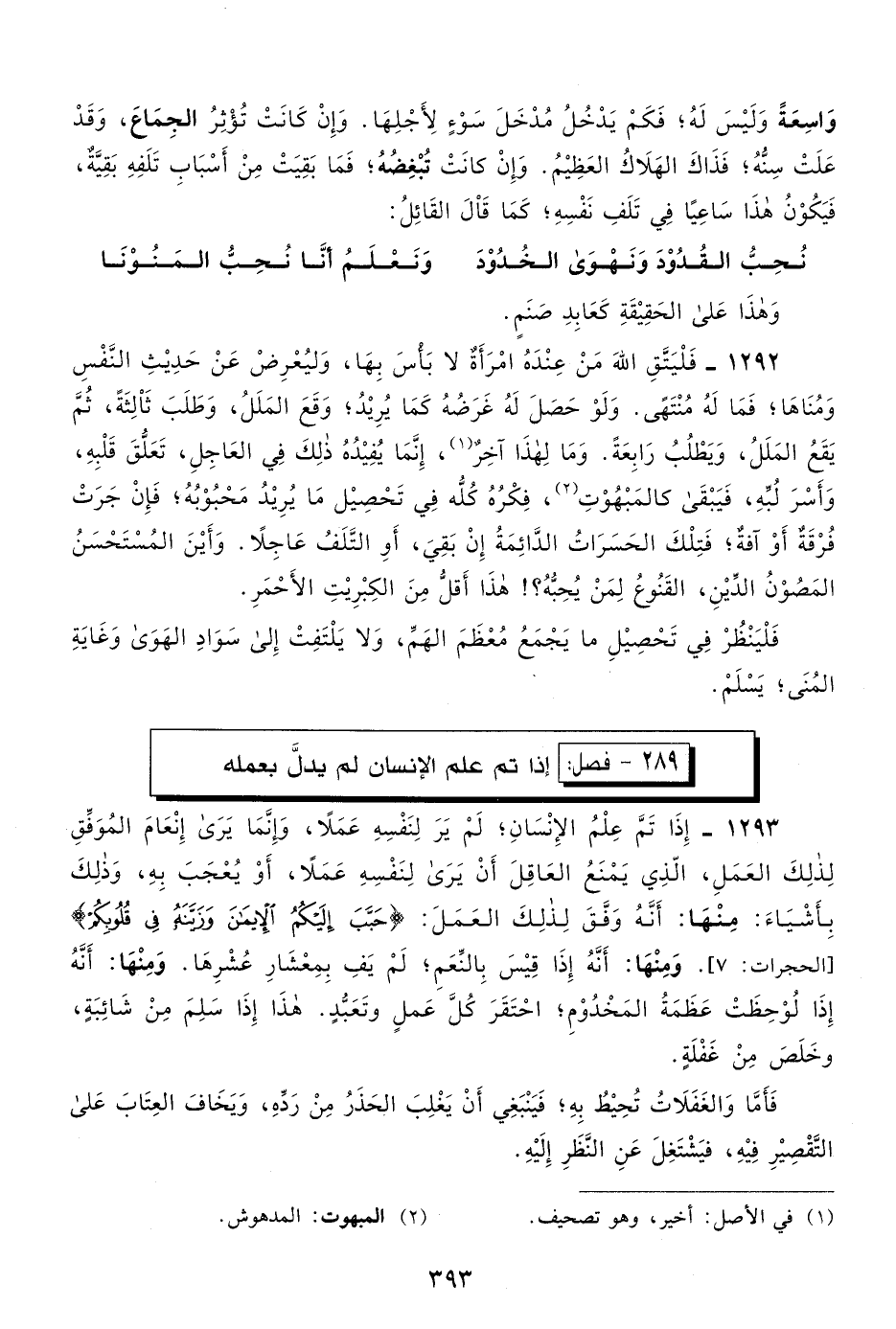 1293- إذا تم علم الإنسان، لم ير لنفسه عملًا؛ وإنما يرى إنعام الموفق لذلك العمل، الذي يمنع العاقل أن يرى لنفسه عملًا، أو يعجب به، وذلك بأشياء: منها: أنه وفق لذلك العمل: {حَبَّبَ إِلَيْكُمُ الْإيمَانَ وَزَيَّنَهُ فِي قُلُوبِكُمْ} [الحجرات: 7] ، ومنها: أنه إذا قيس بالنعم، لم يف بمعشار عشرها، ومنها: أنه إذا لوحظت عظمة المخدوم، احتقر كل عمل وتعبد، هذا إذا سلم من شائبة، وخلص من غفلة.