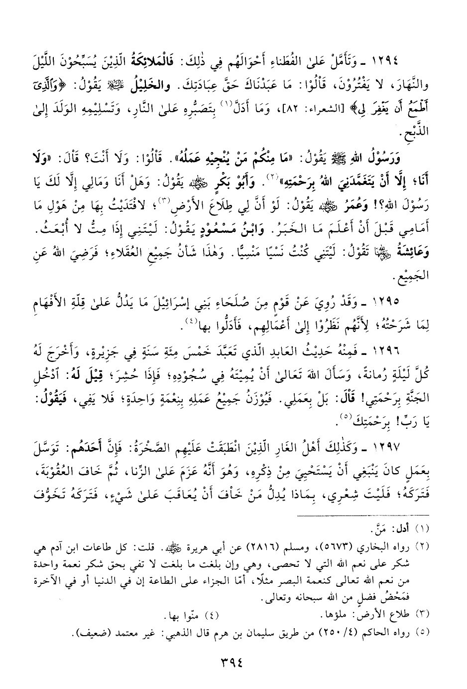 1296- فمنه حديث العابد الذي تعبد خمسمائة سنة في جزيرة، وأخرج له كل ليلة رمانة، وسأل الله تعالى أن يميته في سجوده، فإذا حشر، قيل له: "ادخل الجنة برحمتي! قال: بل بعملي، فيوزن جميع عمله بنعمة واحدة، فلا يفي، فيقول: يا رب! برحمتك"5.