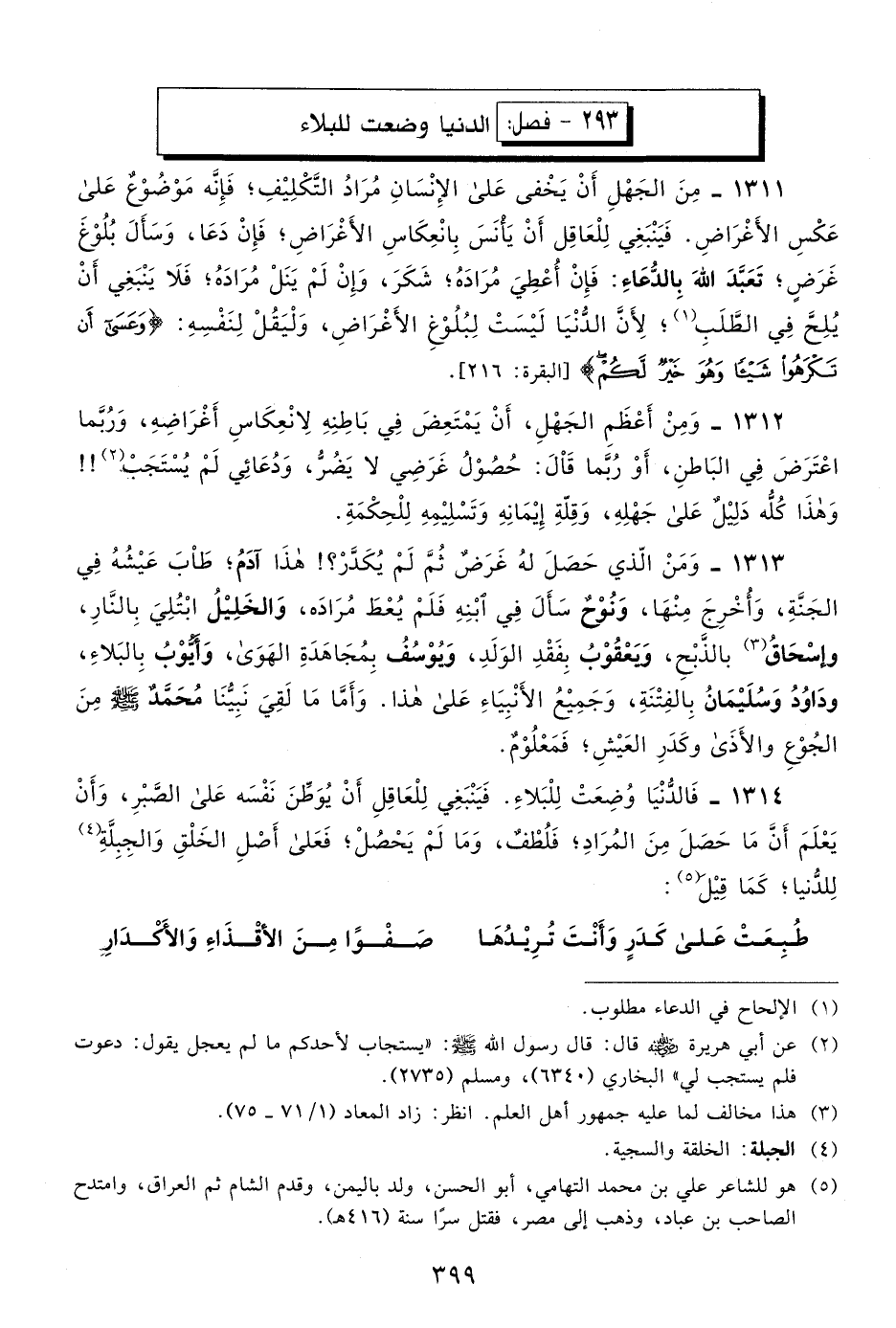 1314- فالدنيا وضعت للبلاء. فينبغي للعاقل أن يوطن نفسه على الصبر، وأن يعلم أن ما حصل من المراد، فلطف، وما لم يحصل، فعلى أصل الخلق والجبلة4 للدنيا، كما قيل5: