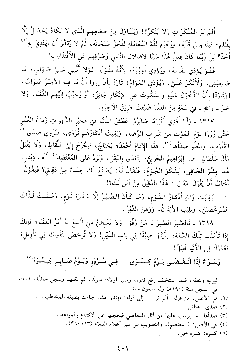 1317- وأنا أفدي أقوامًا صابروا عطش الدنيا في هجير الشهوات زمان العمر حتى رووا يوم الموت من شرب الرضا، وبقيت أذكارهم تروى، فتروي صدى2 القلوب، وتجلو صداها3، هذا الإمام أحمد، يحتاج، فيخرج إلى اللقاط، ولا يقبل مال سلطان. هذا إبراهيم الحربي، يتغذى بالبقل، ويرد على المعتضد4 ألف دينار. هذا بشر الحافي، يشكو الجوع، فيقال له: يصنع لك حساء من دقيق؟ فيقول: