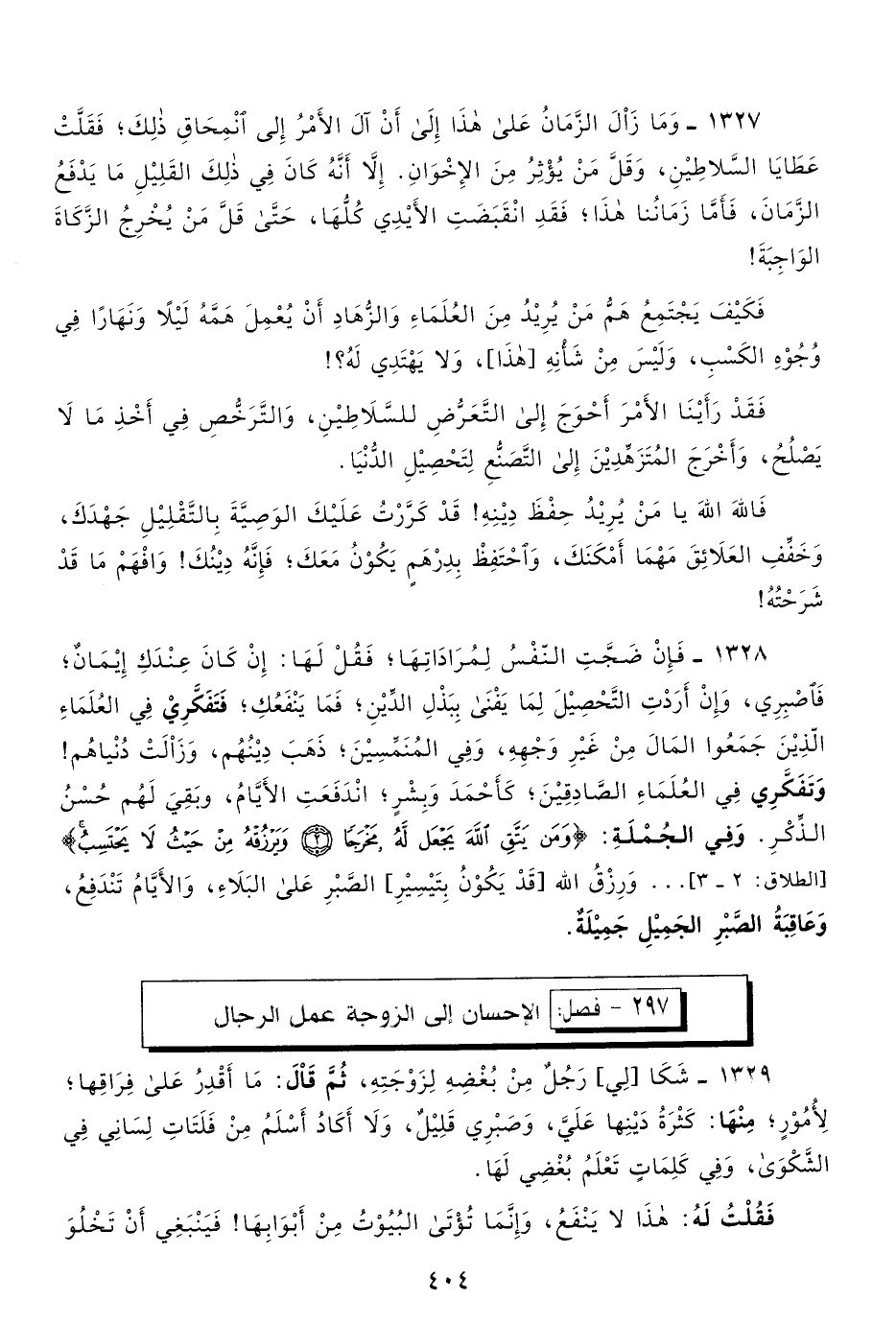 1329- شكا [لي] رجل من بغضه لزوجته، ثم قال: ما أقدر على فراقها، لأمور، منها: كثرة دينها علي، وصبري قليل، ولا أكاد أسلم من فلتات لساني في الشكوى، وفي كلمات تعلم بغضي لها.