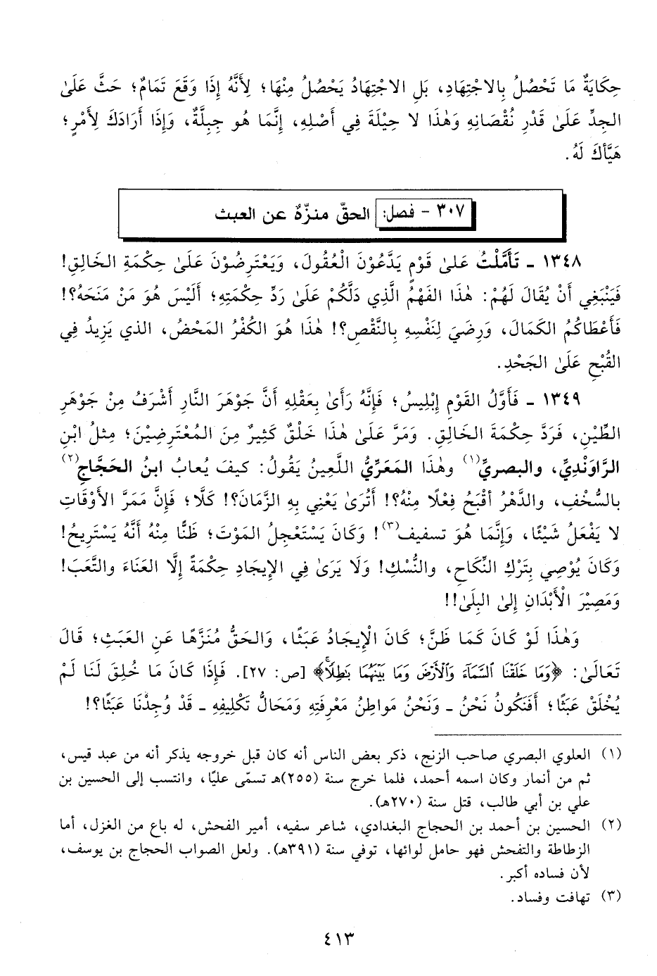 1349- فأول القوم إبليس؛ فإنه رأى بعقله أن جوهر النار أشرف من جوهر الطين، فرد حكمة الخالق، ومر على هذا خلق كثير من المعترضين، مثل ابن الراوندي، والبصري1 وهذا المعري اللعين، يقول: كيف يعاب ابن الحجاج2 بالسخف، والدهر أقبح فعلًا منه؟! أترى يعني به الزمان؟! كلا، فإن ممر الأوقات لا يفعل شيئًا؛ وإنما هو تسفيف3! وكان يتسعجل الموت، ظنًّا منه أنه يستريح! وكان يوصي بترك النكاح، والنسك! ولا يرى في الإيجاد حكمة إلا العناء والتعب! ومصير الأبدان إلى البلى!!
