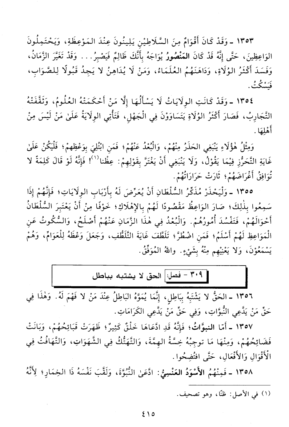 1356- الحق لا يشتبه بباطل؛ إنما يموه الباطل عند من لا فهم له، وهذا في حق من يدعي النبوات، وفي حق من يدعي الكرامات.
