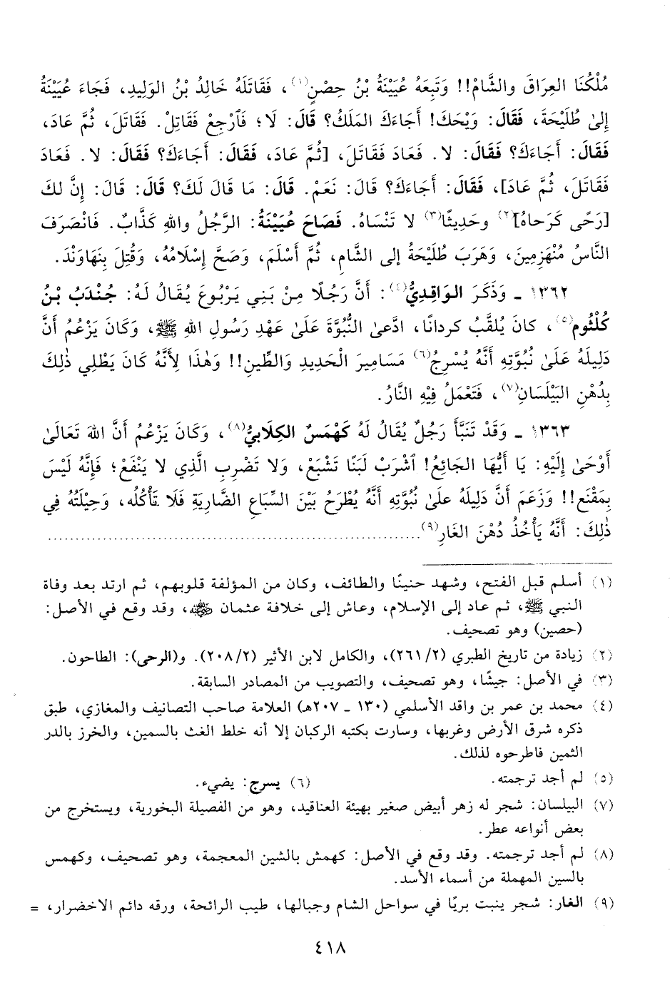 1362- وذكر الواقدي4: أن رجلًا من بني يربوع يقال له: جندب بن كلثوم5، كان يلقب كردانًا، ادعى النبوة على عهد رسول الله صلى الله عليه وسلم، وكان يزعم أن دليلة على نبوته أن يسرج6 مسامير الحديد والطين!! وهذا؛ لأنه كان يطلي ذلك بدهن البيلسان7، فتعمل فيه النار.