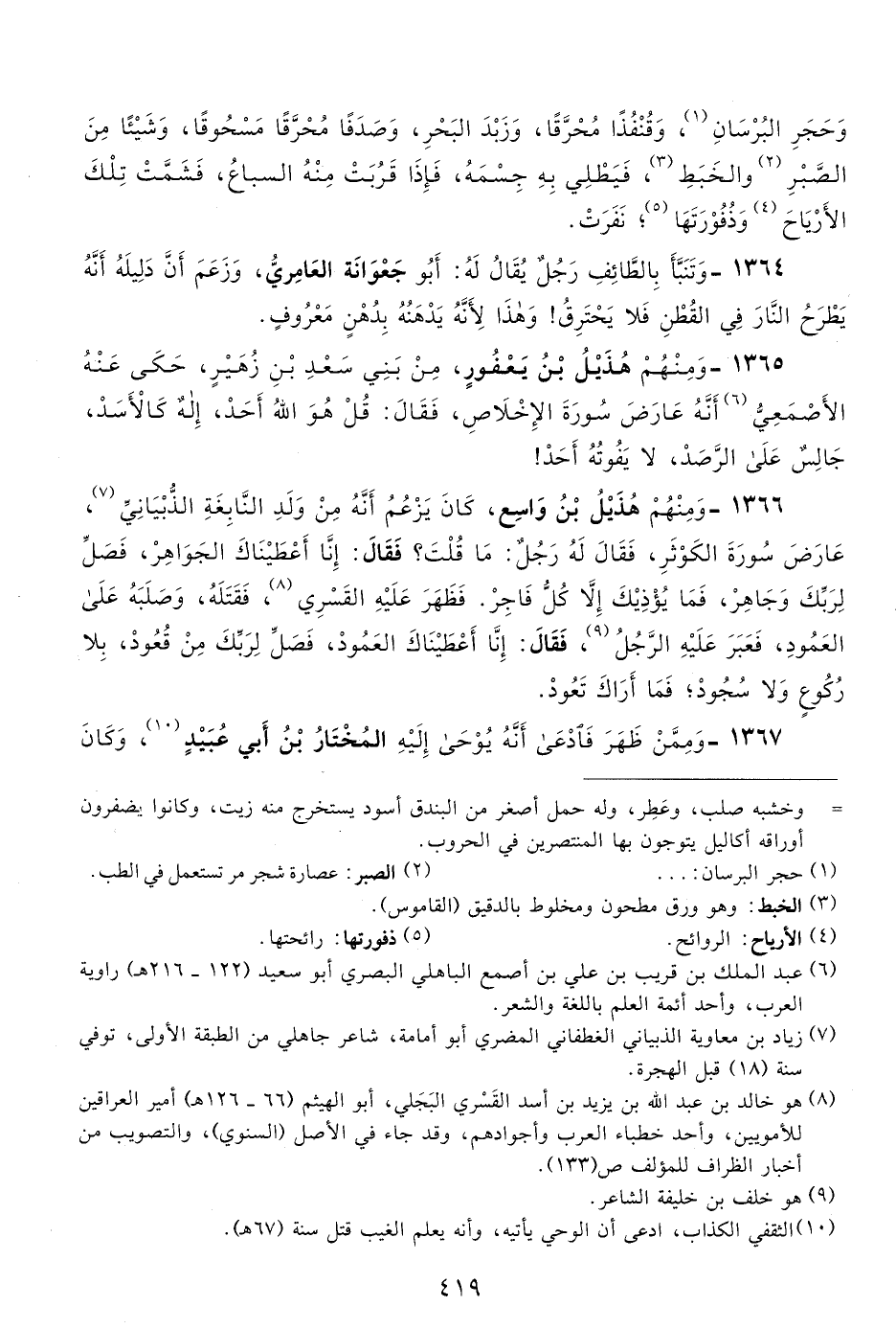 1366- ومنهم هذيل بن واسع، كان يزعم أنه من ولد النابغة الذبياني7، عارض سورة الكوثر، فقال له رجل: ما قلت؟ فقال: "إنا أعطيناك الجواهر، فصل لربك وجاهر، فما يؤذيك إلا كل فاجر"؛ فظهر عليه القسري8، فقتله، وصلبه على العمود، فعبر عليه الرجل9، فقال: "إنا أعطيناك العمود، فصل لربك من قعود، بلا ركوع ولا سجود، فما أراك تعود".