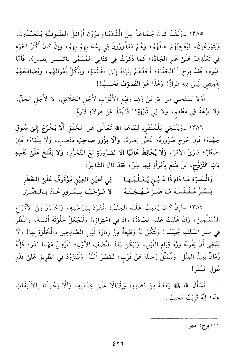 1386- وينبغي للمنفرد لطاعة الله تعالى عن الخلق ألا يخرج إلى سوق جهده؛ فإن خرج ضرورة، غض بصره، وألا يزور صاحب منصب، ولا يلقاه، فإن اضطر، دارى الأمر، ولا يخالط عاميًّا إلا لضرورة مع التحرز، ولا يفتح على نفسه باب التزوج، بل يقنع بامرأة فيها دين، فقد قال الشاعر: