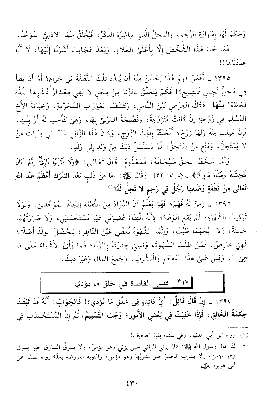 1397- إن قال قائل: أي فائدة في خلق ما يؤذي؟! فالجواب: أنه قد ثبتت حكمة الخالق؛ فإذا خفيت في بعض الأمور، وجب التسليم، ثم إن المستحسنات في