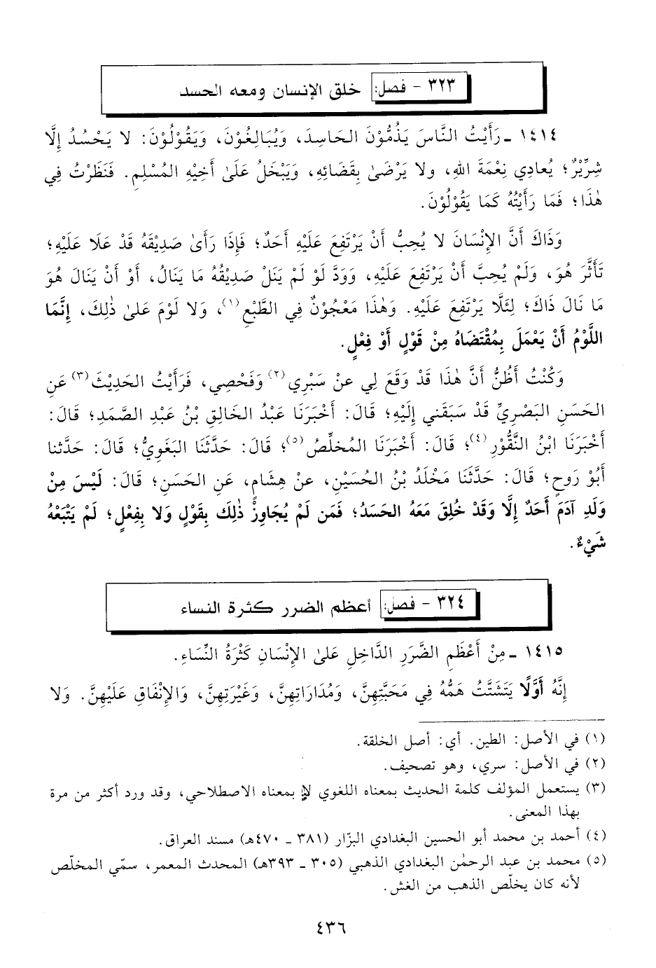 وكنت أظن أن هذا قد وقع لي عن سبري2 وفحصي؛ فرأيت الحديث3 عن الحسن البصري قد سبقني إليه، قال: أخبرنا عبد الخالق بن عبد الصمد، قال: أخبرنا ابن النقور4، قال: أخبرنا المخلص5، قال: حدثنا البغوي، قال: حدثنا أبو روح، قال: حدثنا مخلد بن الحسين، عن هشام، عن الحسن، قال: ليس من ولد آدم أحد إلا وقد خلق معه الحسد، فمن لم يجاوز ذلك بقول ولا بفعل، لم يتبعه شيء.