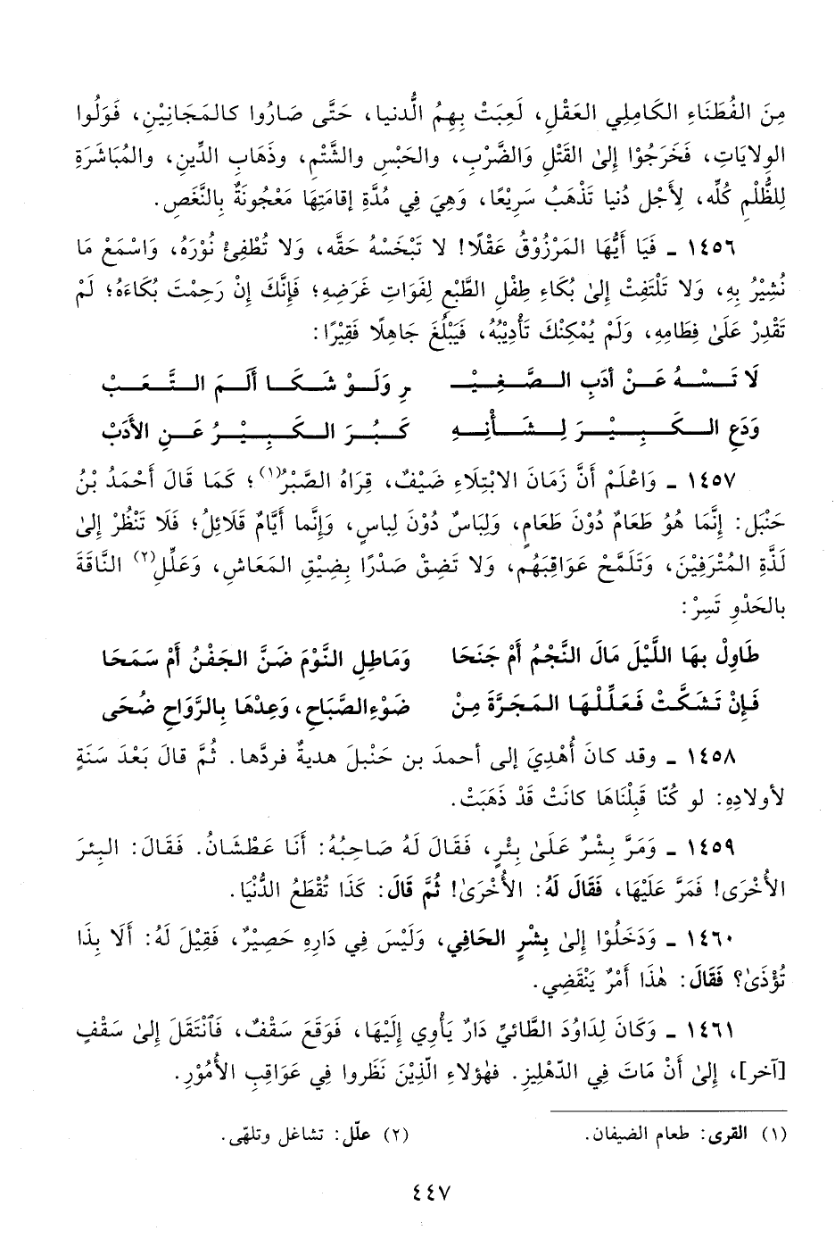 1458- وقد كان أهدي إلى أحمد بن حنبل هدية فردها. ثم قال بعد سنة لأولاده: لو كنا قبلناها كانت قد ذهبت.