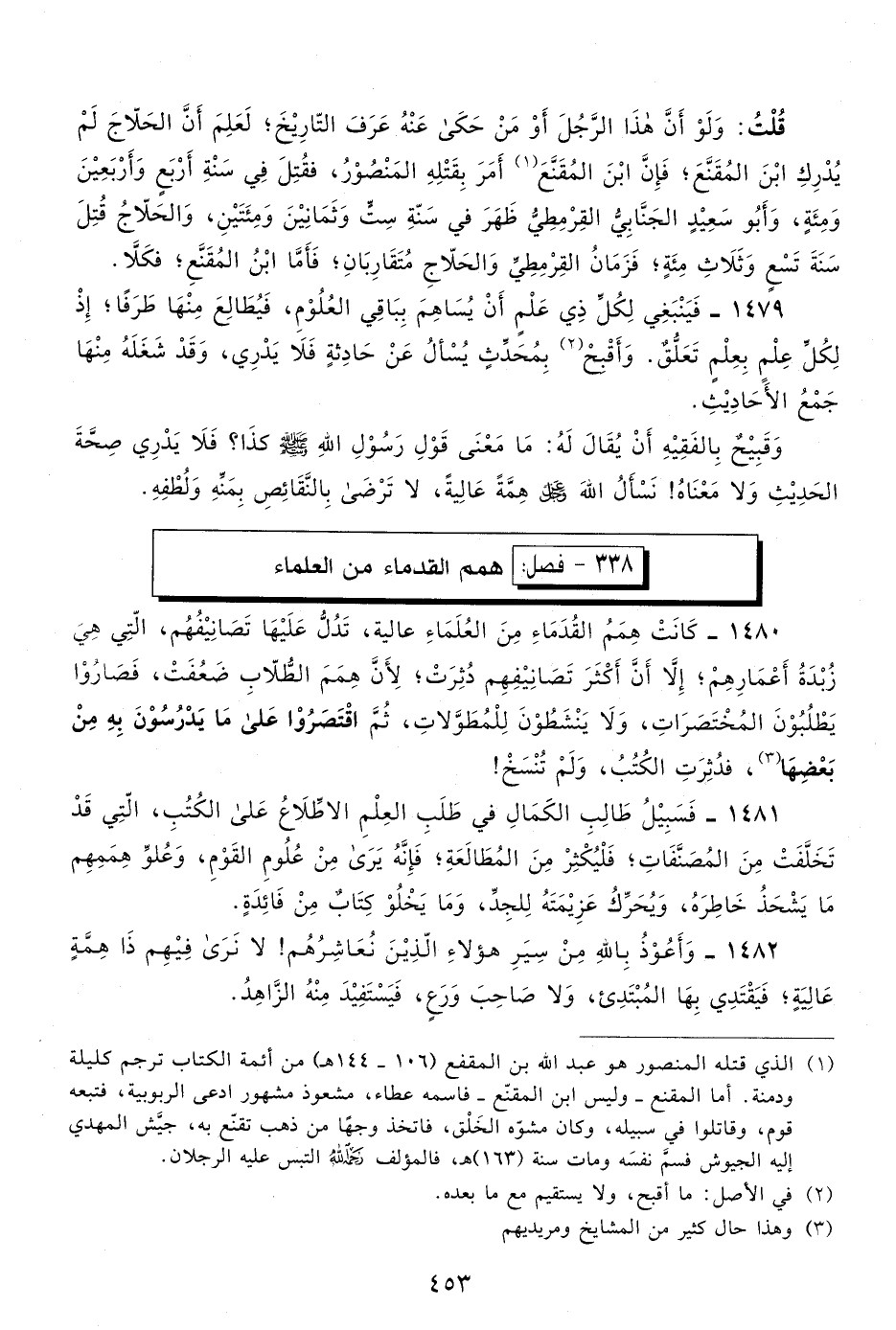 1480- كانت همم القدماء من العلماء عالية، تدل عليها تصانيفهم، التي هي زبدة أعمارهم؛ إلا أن أكثر تصانيفهم دثرت؛ لأن همم الطلاب ضعفت، فصاروا يطلبون المختصرات، ولا ينشطون للمطولات، ثم اقتصروا على ما يدرسون به من بعضها1، فدثرت الكتب، ولم تنسخ!