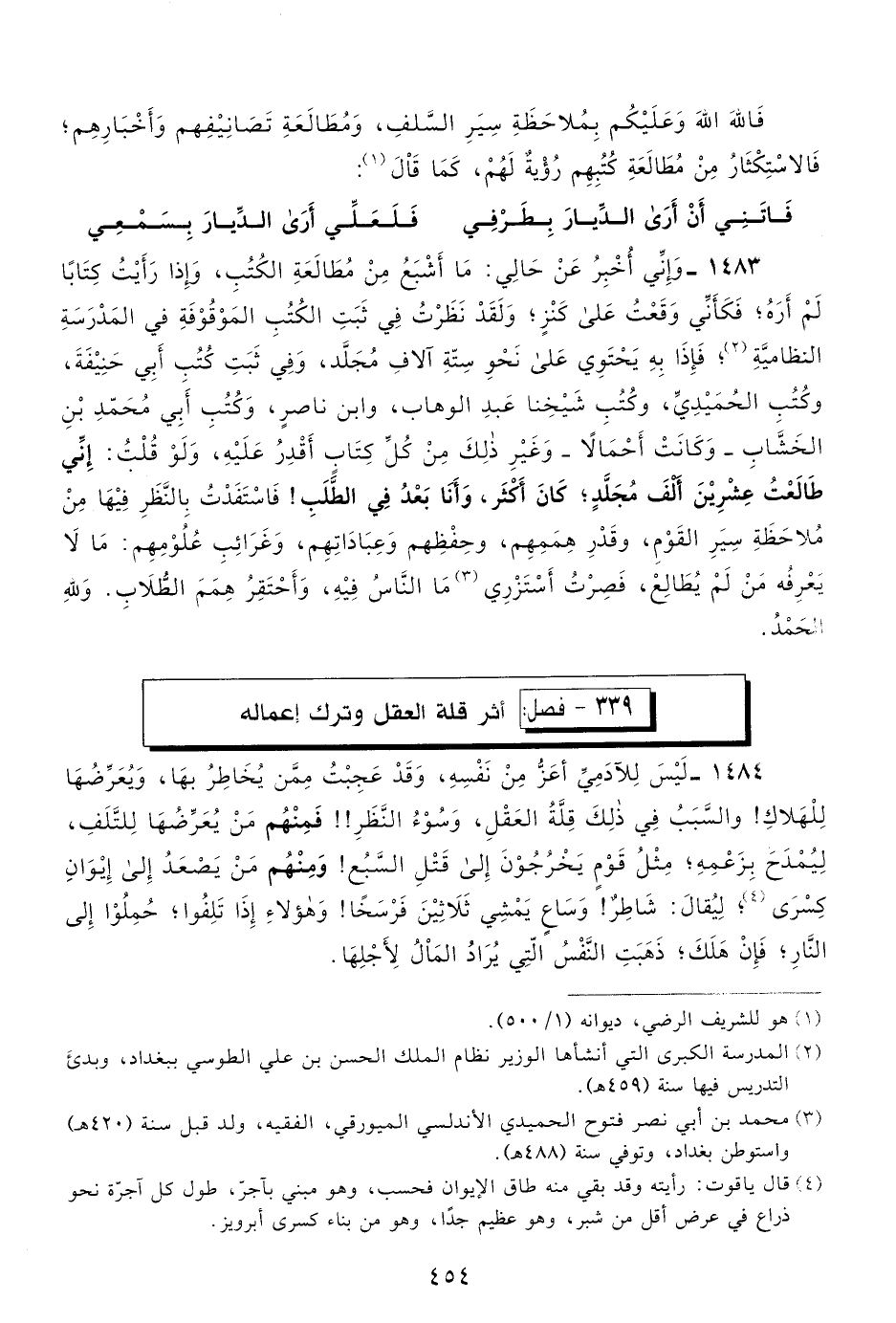 1483- وإني أخبر عن حالي: ما أشبع من مطالعة الكتب، وإذا رأيت كتابًا لم أره، فكأني وقعت على كنز، ولقد نظرت في ثبت الكتب الموقوفه في المدرسة النظمية2؛ فإذا به يحتوي على نحو ستة آلاف مجلد، وفي ثبت كتب أبي حنيفة، وكتب الحميدي، وكتب شيخنا عبد الوهاب، وابن ناصر، وكتب أبي محمد بن الخشاب -وكانت أحمالًا- وغير ذلك من كل كتاب أقدر عليه، ولو قلت: إني طالعت عشرين ألف مجلد، كان أكثر، وأنا بعد في الطلب! فاستفدت بالنظر فيها من ملاحظة سير القوم، وقدر هممهم، وحفظهم وعباداتهم، وغرائب علومهم: ما لا يعرفه من لم يطالع، فصرت أستزري3 ما الناس فيه، وأحتقر همم الطلاب. ولله الحمد.